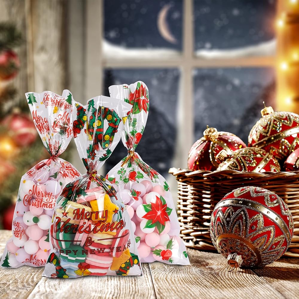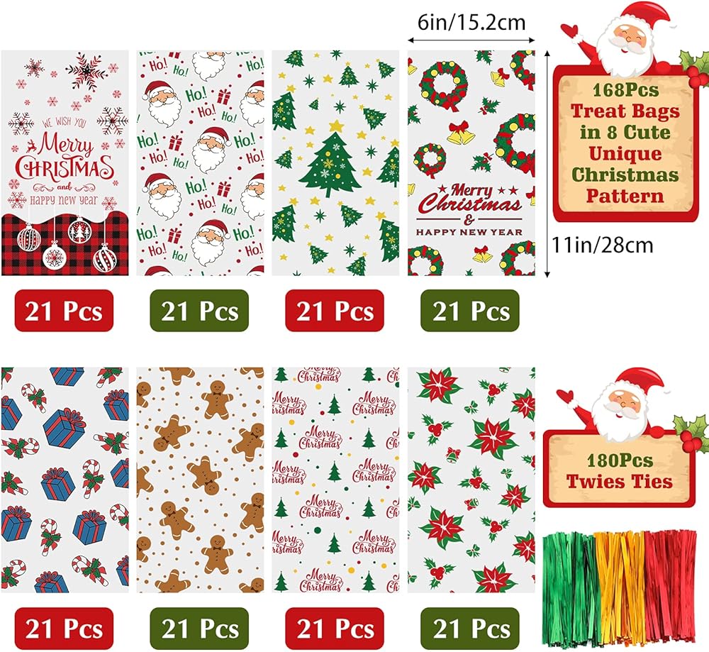 تشمل العبوة: تأتي مع 168 كيس سيلوفان و180 ربطة عنق ملونة، مناسبة جدًا لحفلات عيد الميلاد والهدايا.