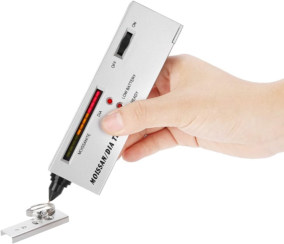 اختبار احترافي: إذا كان الحجر ألماسًا حقيقيًا، فسيتم عرض مؤشر أخضر. تصدر وظيفة التنبيه المعدنية صوتًا مستمرًا عندما يلمس المستخدم المعدن عن طريق الخطأ بدلاً من الحجر.