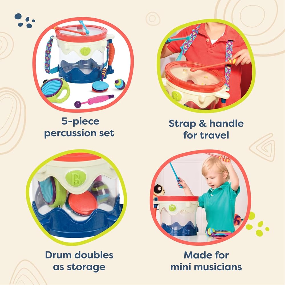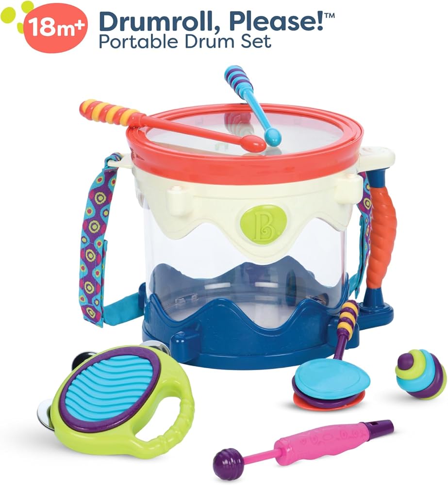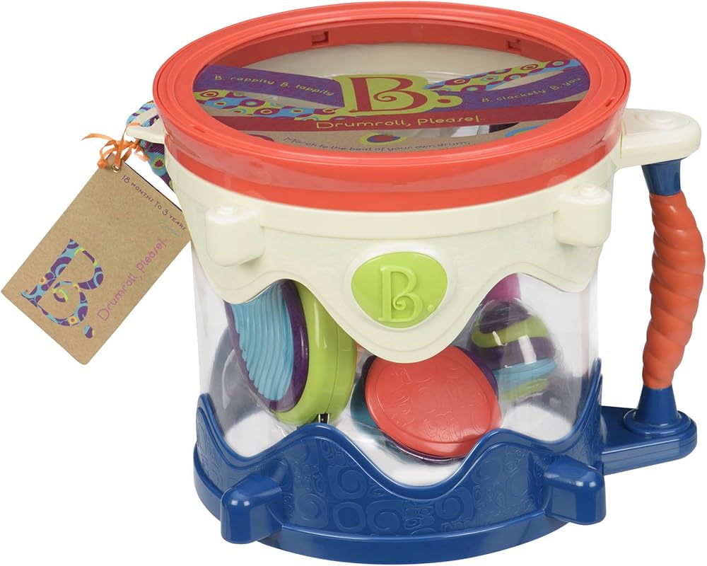 درام رول، من فضلك! (على محمل الجد، لا يوجد اسم أفضل لمجموعة طبول الألعاب إذا سألتني) احصل على بي. تغلب على الفرقة وخذها على الطريق مع الطبل من فضلك من بي تويز. هذا العرض المحمول عبارة عن طبلة للأطفال مليئة بـ 6 آلات موسيقية ألعاب. إمكانيات موسيقية لا حصر لها! امسك المقبض وخذ السوار معك أينما ذهبت. بفضل هيكلها المتين المقاوم للأطفال الصغار، فإن مجموعة الآلات الموسيقية هذه هي الطريقة المثالية لتقديم الموسيقى للرضع والأطفال الصغار. تأتي مجموعة ألعاب الطبول للأطفال الصغار هذه مع طبلة لعبة، و1 بيضة شاكا المخفوقة، و1 عصا مع كاستانيت (كلاكرز)، 1 دفف، 1 صافرة لعبة و2 عصا طبل رابيتي. أدوات الأطفال الصغار والرضع ملونة وغير تقليدية مع قوامها الوعر وألوانها الراقية. هذه الألعاب الموسيقية السبعة للأطفال سهلة الإمساك والإمساك، مثالية للأيدي الصغيرة والعقول الفضولية. التصميم فريد وغير تقليدي بما يكفي لجعل الأطفال الأكبر سنًا يصنعون موسيقاهم الخاصة. تتميز مجموعة اللعب الموسيقية هذه من بي تويز بتغليف معاد تدويره وقابل لإعادة التدوير. درام رول بليز هي مجموعة طبول للأطفال الرضع والأطفال الصغار من سن 18 شهرًا فما فوق. ب. جويفول. ب. فن بي. شاكي بي. ميوزيكال بي. هيرد بي. أنت