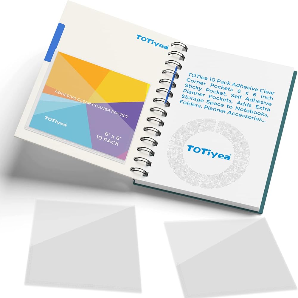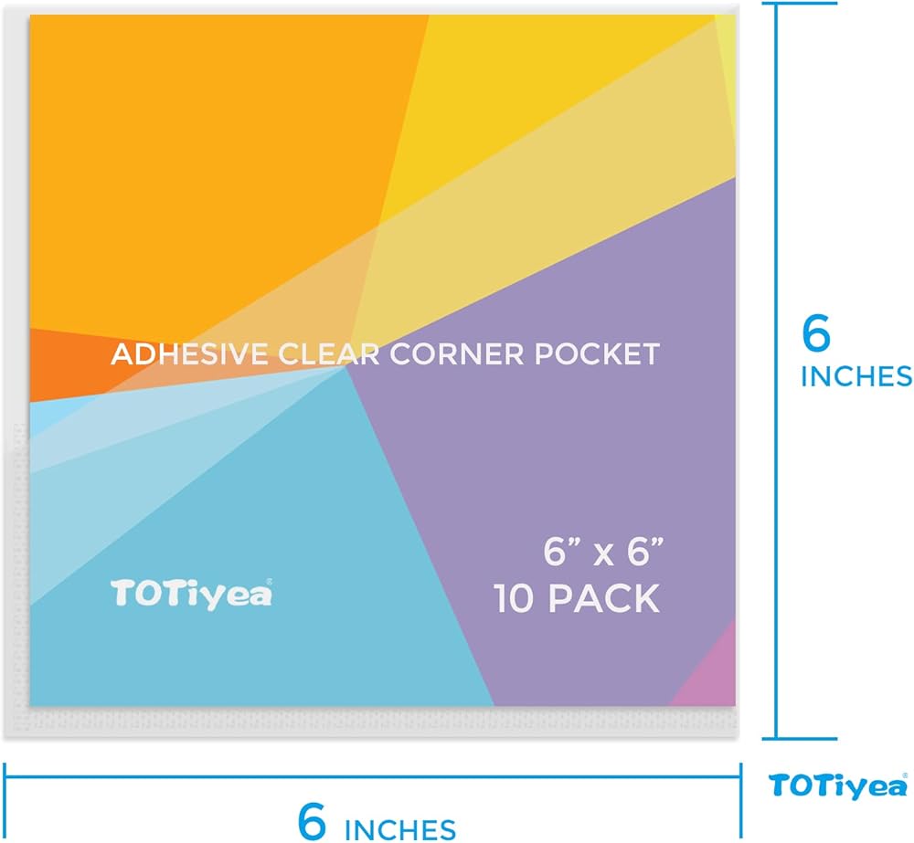 TOTiea 10 Pack Adhesive Clear Corner Pockets 6 x 6 Inch Sticky Pocket, Self Adhesive Planner Pockets, Adds Extra Storage Space to Notebooks, Folders, Planner Accessories