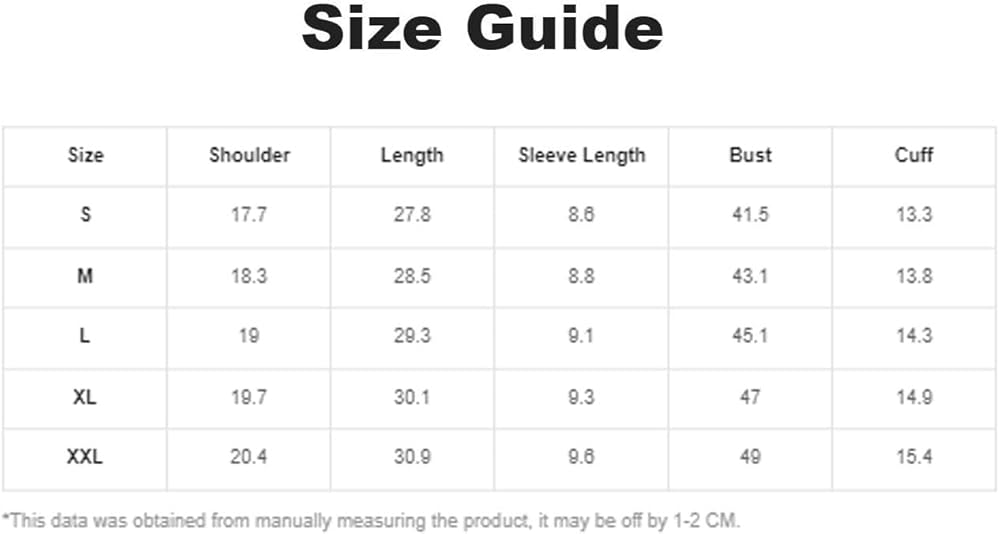 XX-Large—— Shoulder:20.4", Length:30.9", Sleeve Length:9.6", Bust:49", Cuff:15.4"