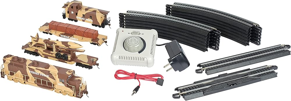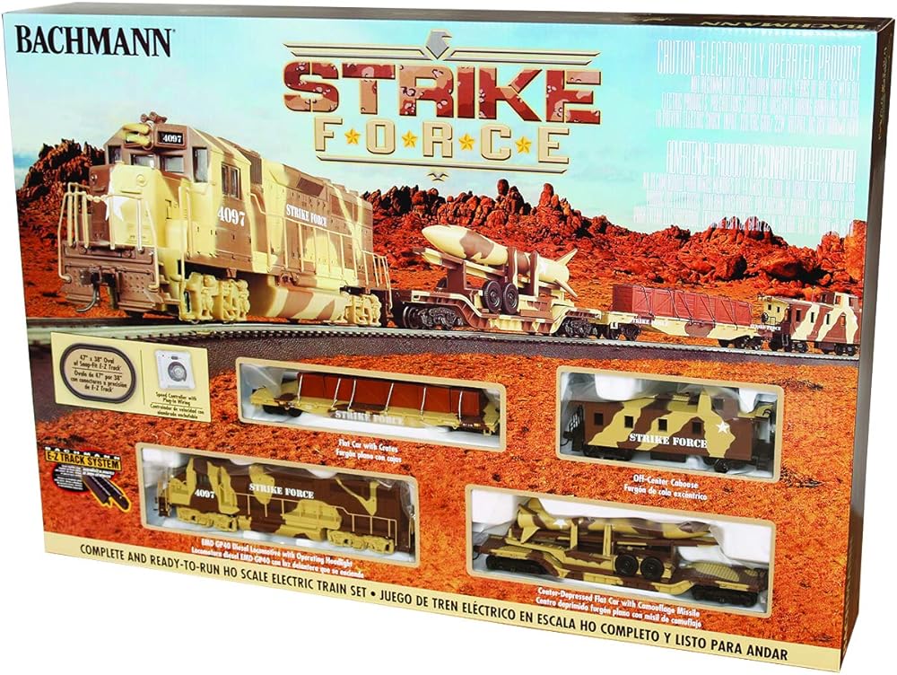 لعب النقل بالسكك الحديدية دورًا مهمًا في الحملات العسكرية الأمريكية الناجحة منذ الحرب الأهلية. غالبًا ما تكون القطارات العسكرية بمثابة العمود الفقري اللوجستي للعمليات الكبيرة، حيث تقدم الأفراد والأسلحة والذخيرة والطعام إلى القوات في الميدان. مع قطار سترايك فورس الخاص بنا، نكرم الجهود الدؤوبة التي يبذلها رجالنا ونسائنا في الزي الرسمي. تتضمن مجموعة القطار الجاهزة للتشغيل ما يلي: قاطرة ديزل اي ام دي GP40 مع مصباح أمامي للتشغيل وسيارة مسطحة مع أقفاص وسيارة مسطحة منخفضة في المنتصف مع صاروخ مموه وقبة كابوز مثبتة على الجسم E-Z Mate (c) 47 انش × 38 انش بيضاوية من مسار E-Z (c)، بما في ذلك 12 قطعة من المسار المنحني، 1 قطعة من مستقيم المسار، و1 حزمة طاقة لمحطة إعادة التدوير ووحدة التحكم في السرعة ودليل تعليمات مصور تحذير: خطر الاختناق - أجزاء صغيرة! غير مخصص للأطفال دون سن 3 سنوات.