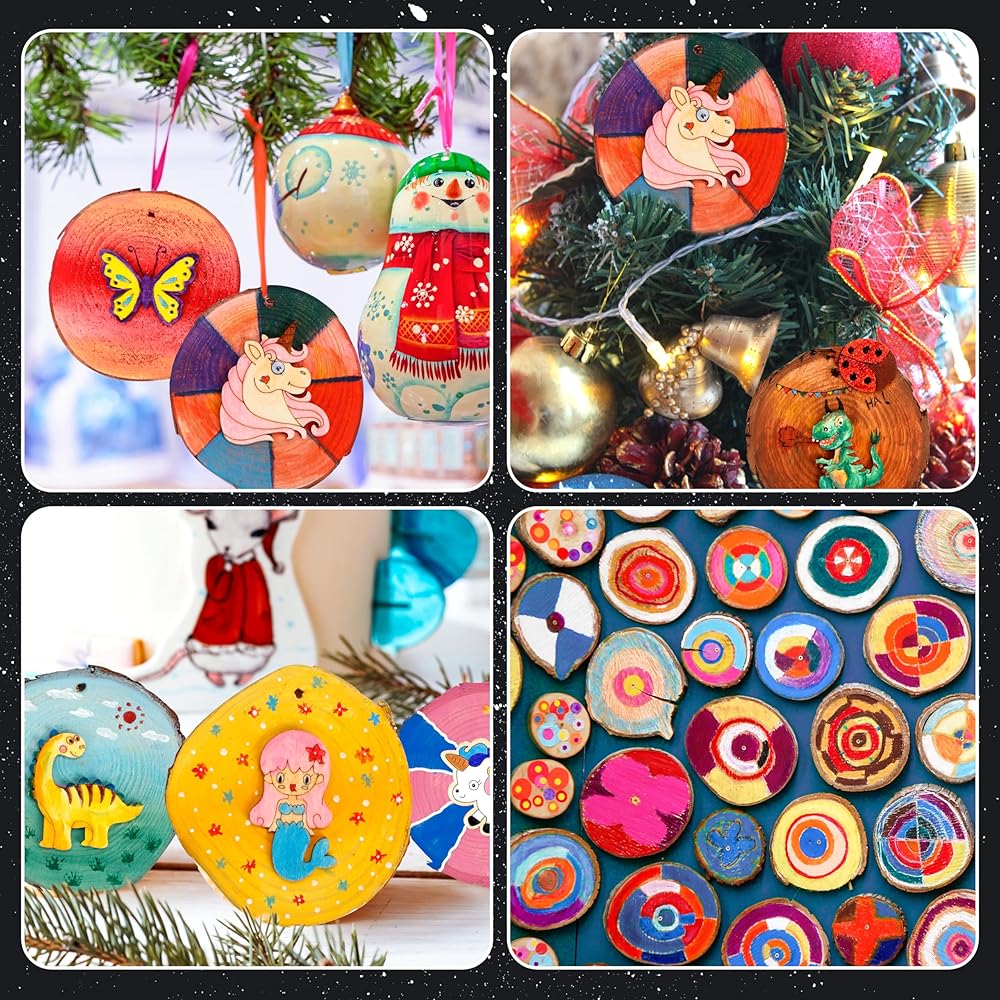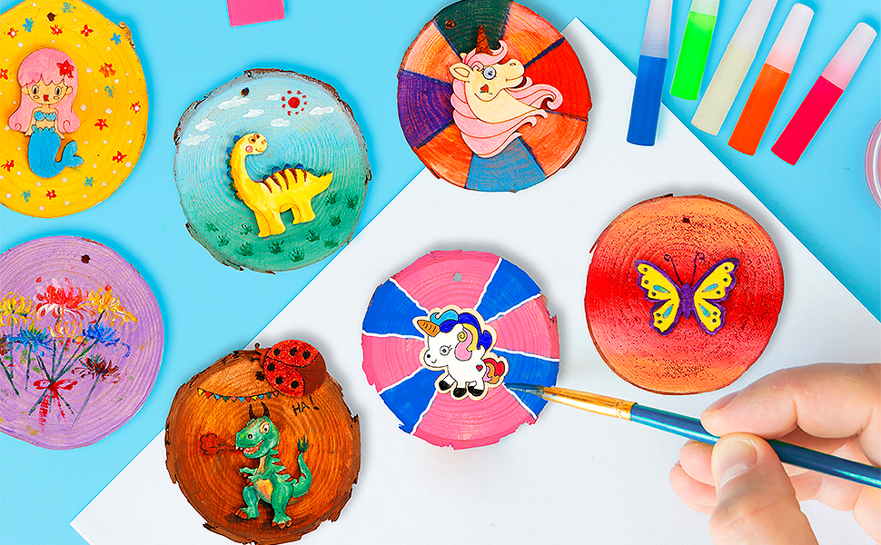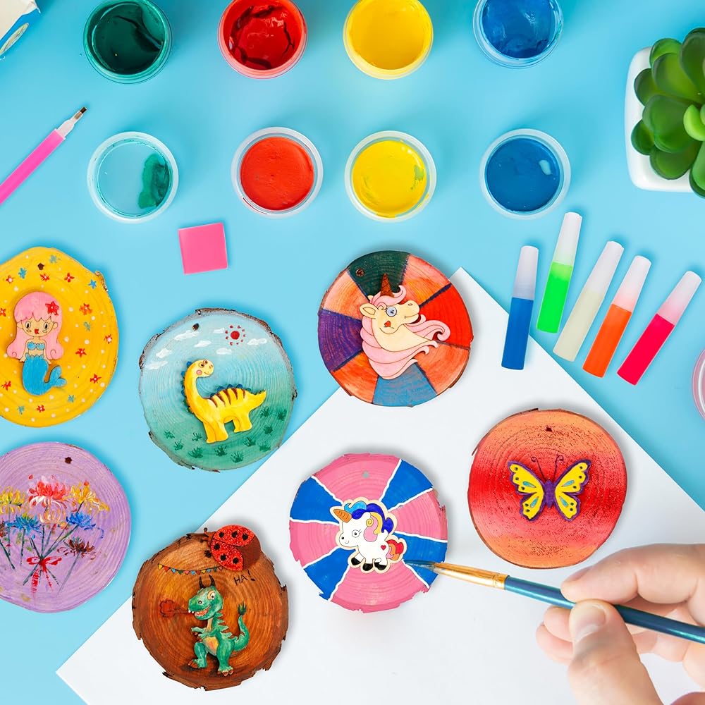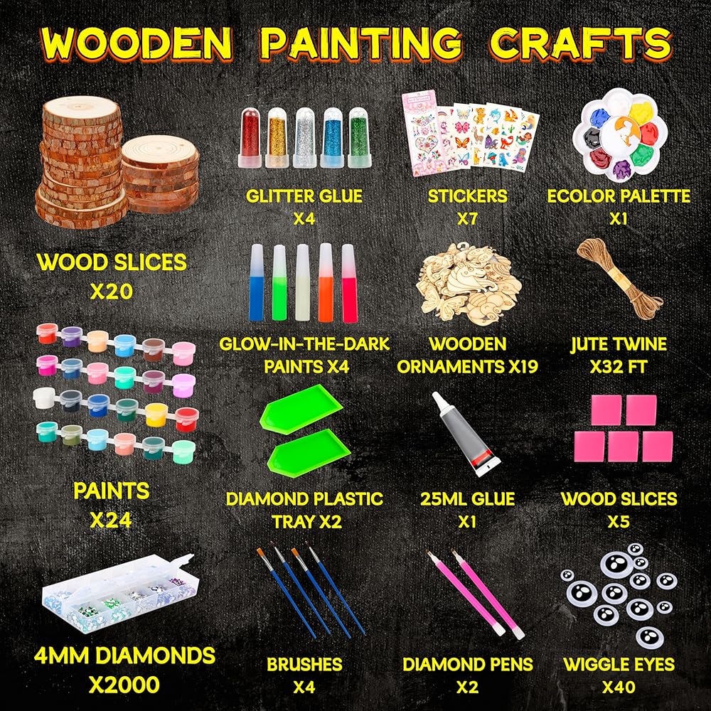 【Packge Includes】20 natural wood slices, 24 painting pots & pigment tray, painting brush, arylic diamonds and tools, transfer stickers, wiggle eyes, glow-in-the-dark glues, juter rope, and other accessories...