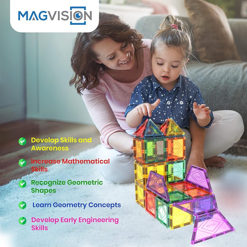 مجموعة بناء البلاط المغناطيسي للأطفال - في عصر جديد من الشاشات والإلكترونيات، تعيد البلاط المغناطيسي MagVision طريقة بسيطة وتعليمية، والأهم من ذلك، طريقة ممتعة للأطفال لقضاء وقتهم. يمكن استخدامها بمفردها، مع الأشقاء، والأصدقاء، والآباء، ومقدمي الرعاية أو حتى المعلمين.