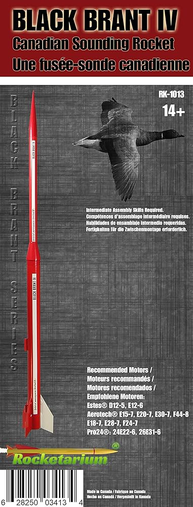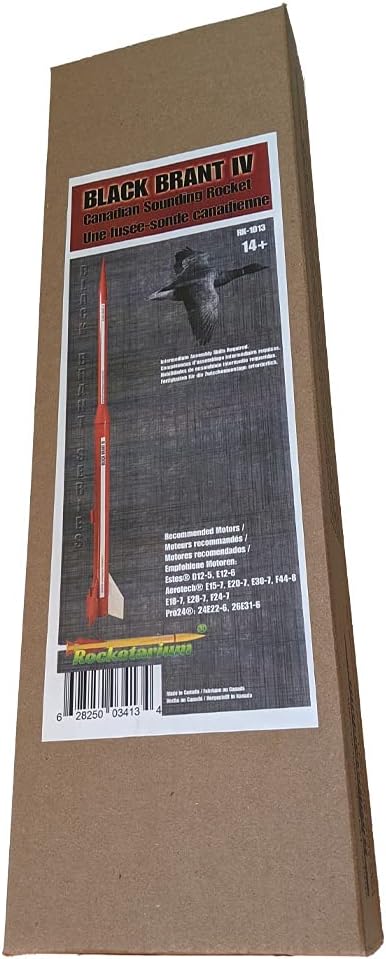 يبلغ طول صاروخ روكيتاريم Black Brant IV أكثر من 3 1/2 قدم، وهو نموذج صاروخ طائر كبير قادر على ارتفاعات تزيد عن 1650 قدمًا (500 متر) على محرك F قبل العودة إلى الأرض حتى يمكن تحليقه مرارًا وتكرارًا. على عكس معظم طرازات الصواريخ، تحتوي بلاك برانت IV على نظام حاجز طرد مما يعني أنه لا يلزم حشو الاسترداد للطيران. كان صاروخ بلاك برانت 4 الأصلي من مرحلتين يتكون من المرحلة الأولى من بلاك برانت في المرحلة الثانية مع المرحلة الثانية من بلاك برانت III واستخدمته وكالة الفضاء الكندية وناسا. هذه المجموعة هي نموذج أحادي المرحلة من بلاك برانت IV. تتطلب (غير متضمنة): لوحة إطلاق متوافقة ووحدة تحكم مع قضيب إطلاق 3/16 انش، غراء خشبي، غراء سي ايه، سكين هواية، ورق صنفرة، برايمر، طلاء وطبقة شفافة. محركات الصواريخ مع أشعال. محركات الصواريخ الموصى بها: D12-5، E12-6، E15-7، E20-7، E30-7، F44-8، E18-7، E28-7، F24-7