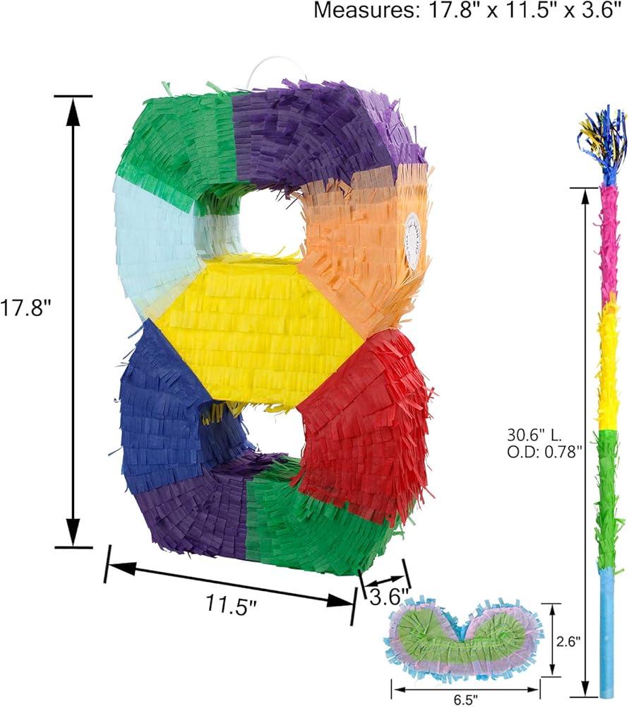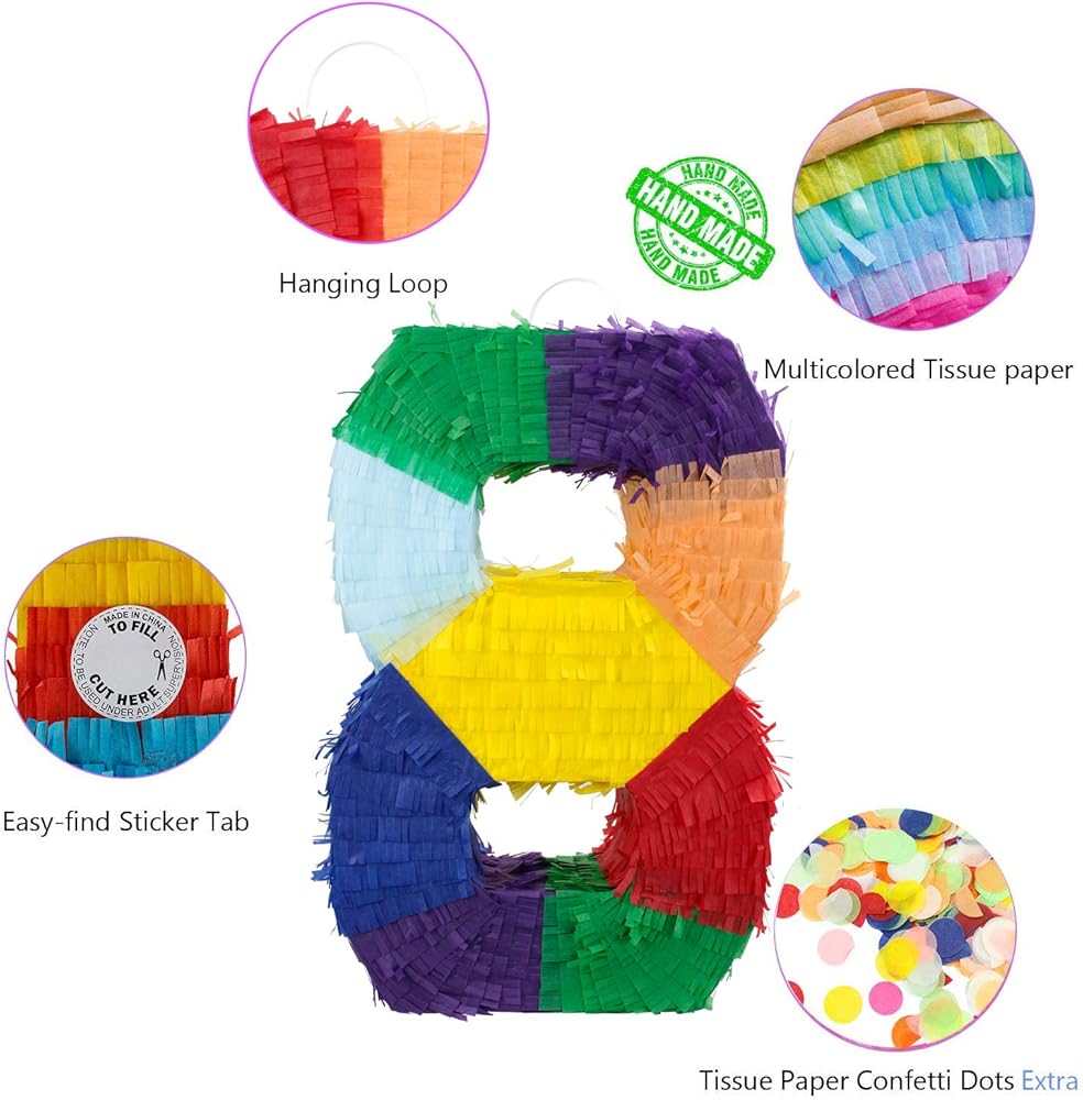 أضف البهجة على حفلتك مع هذه البيناتا المرحة في شكل أرقام. تم تزيين البيناتا ثلاثية الأبعاد بأهداب ورقية ولمسة نهائية. يتم تعليقه بالحبل.
