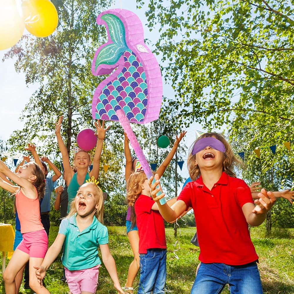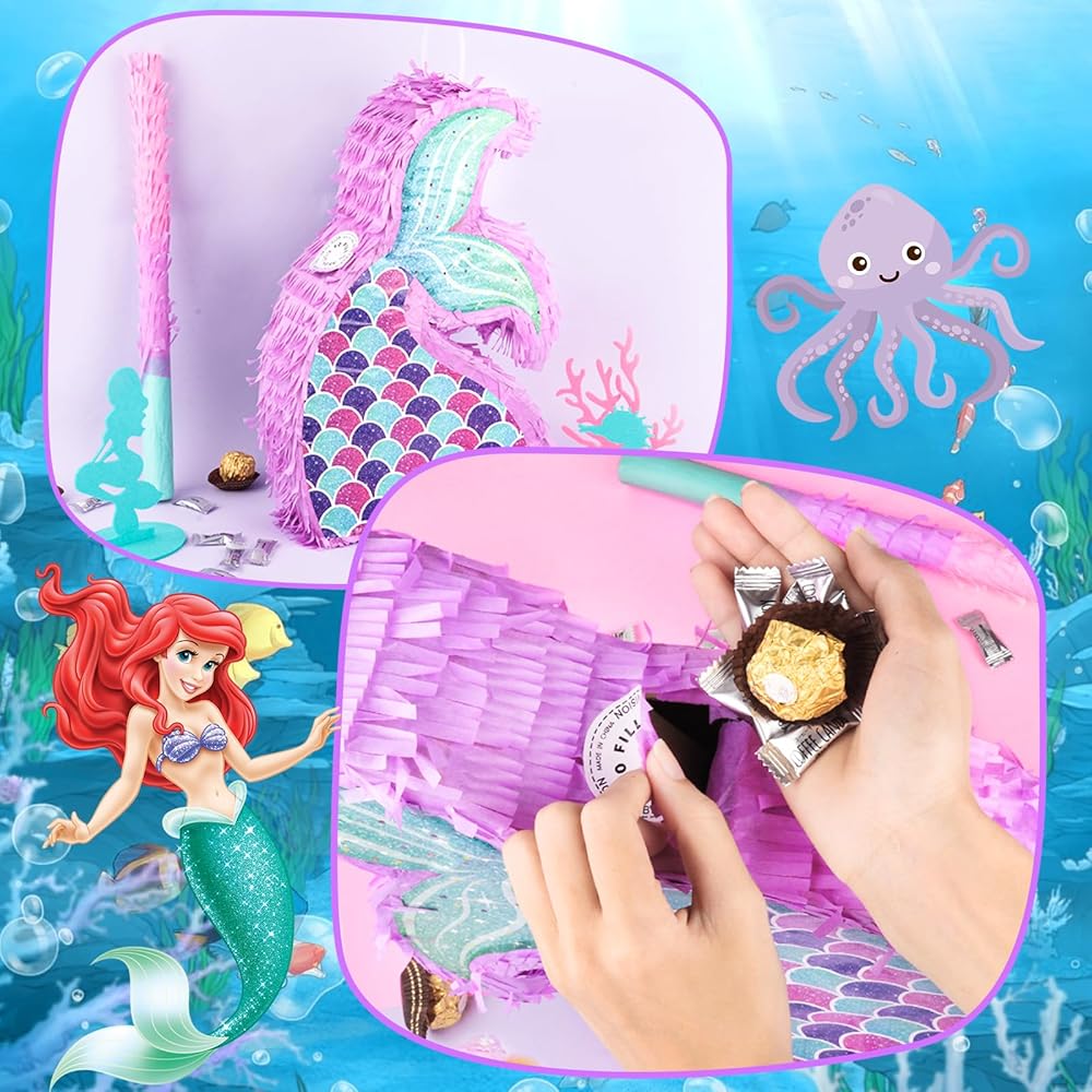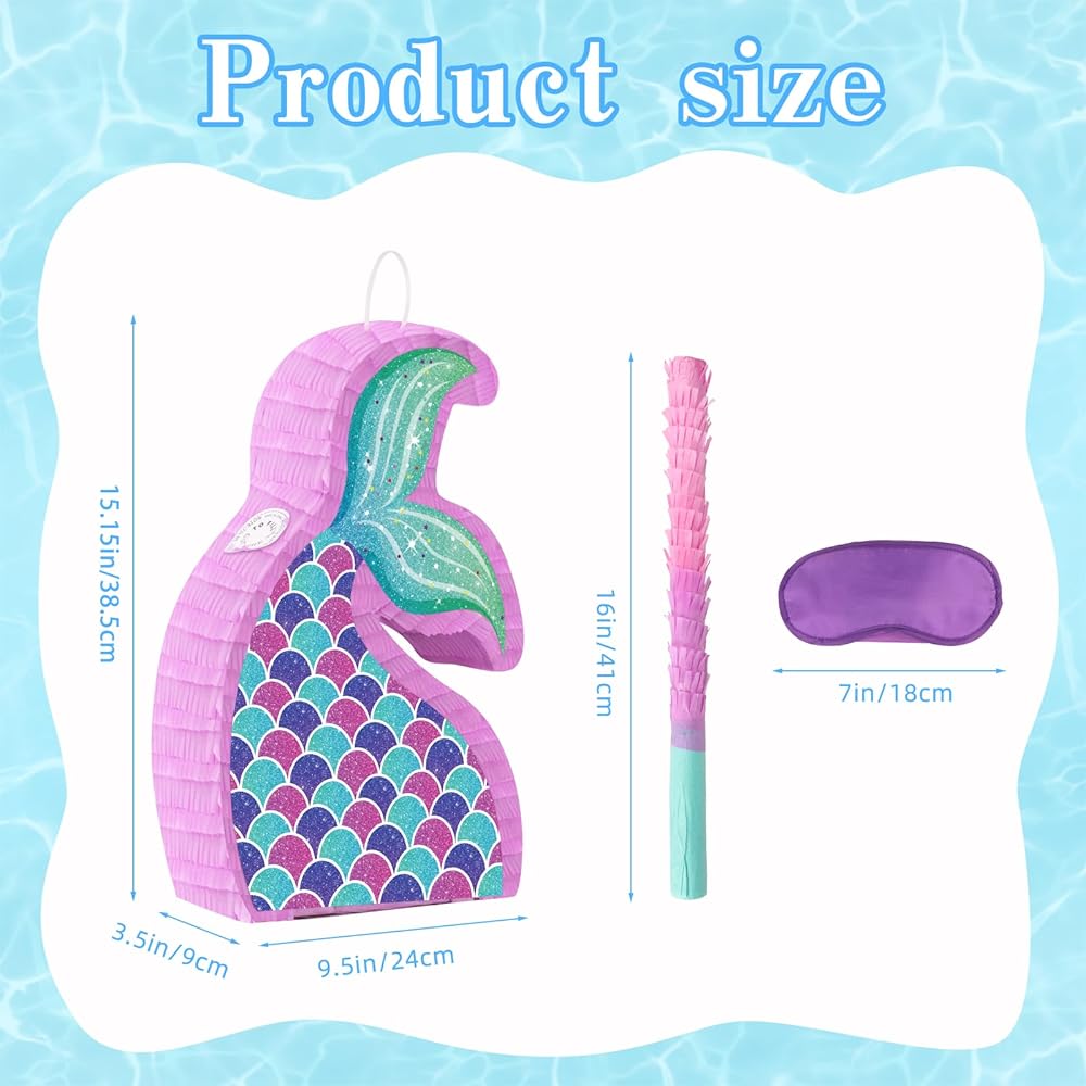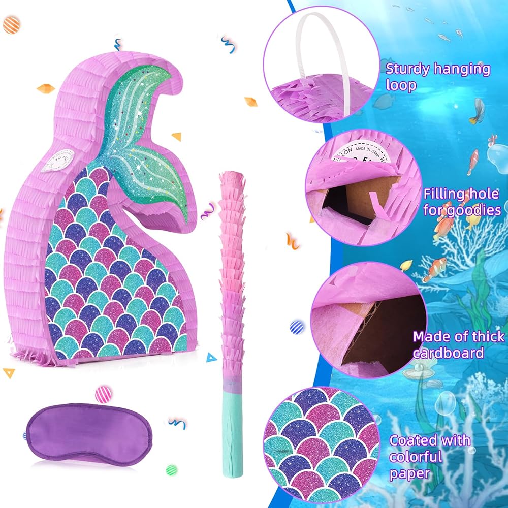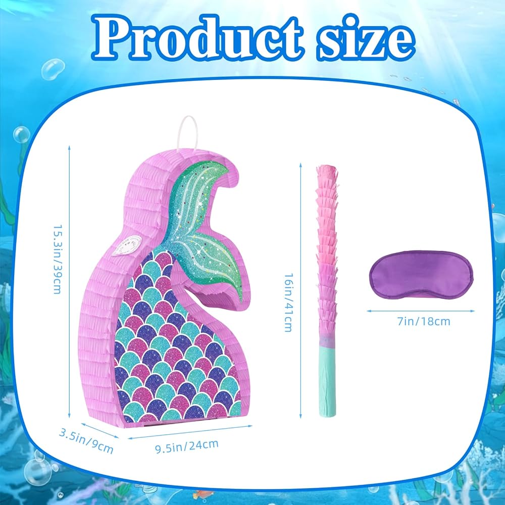 ستحصل على: تحتوي لوازم حفلات حورية البحر الخاصة بنا على 1 بيناتا حورية البحر و1 عصابة عين و1 عصا بيناتا يمكنك التناوب على ضرب البينياتا بمضرب لإطلاق المفاجأة بالداخل، مما سيجلب الكثير من المرح للحفلة