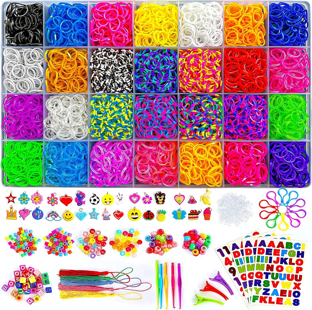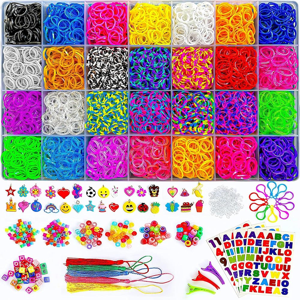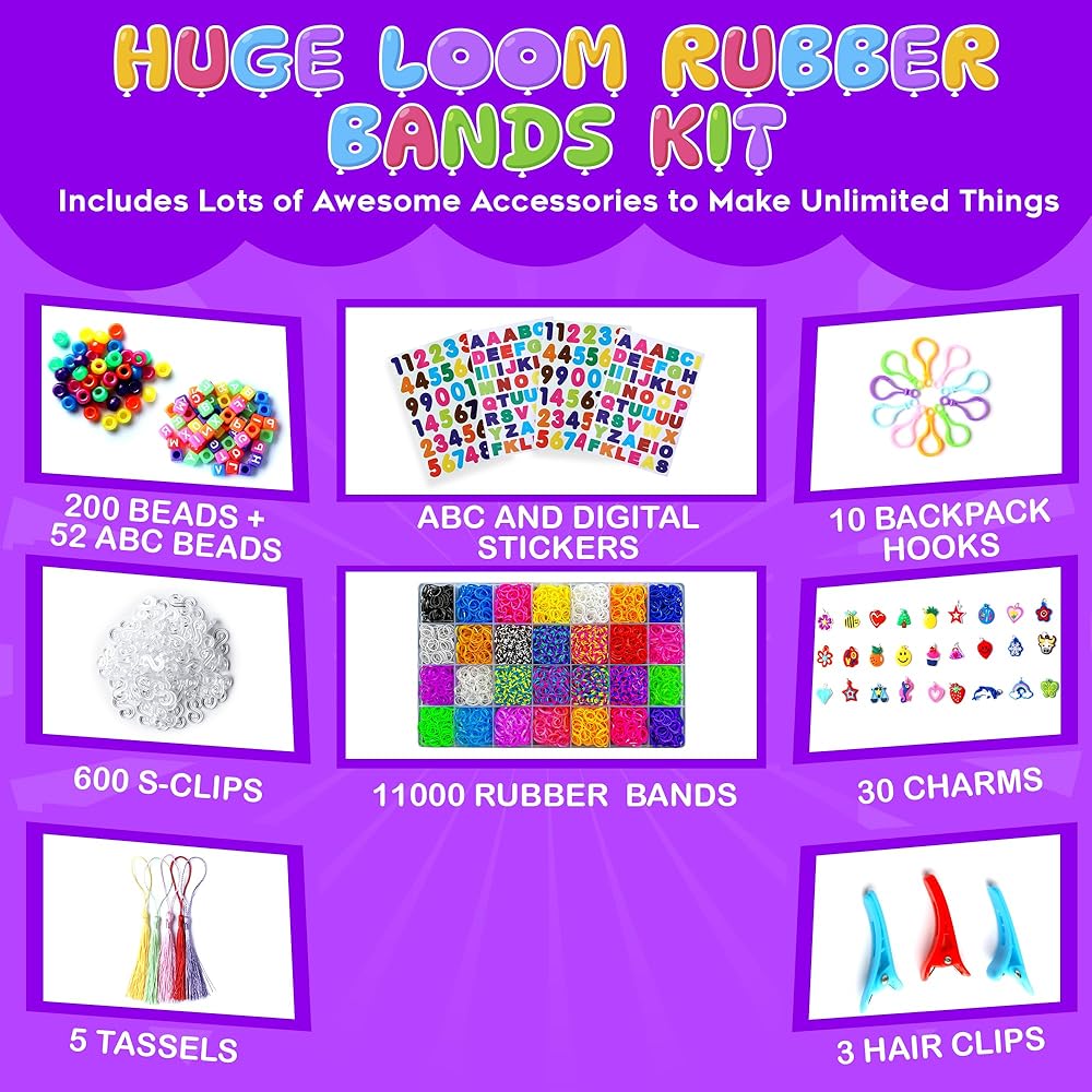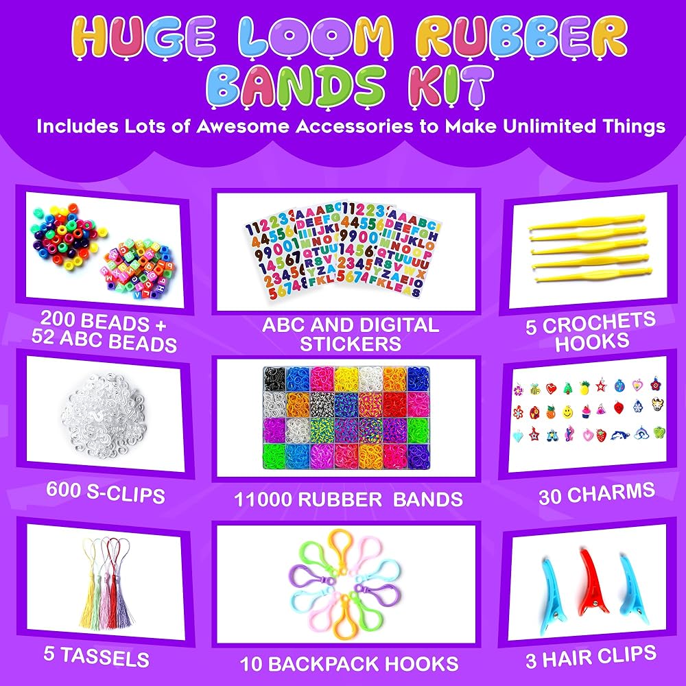 ❄ مجموعة عصابات ميجا لوم فاخرة: سيحصل أطفالك على مجموعة كاملة من السعادة في شكل 28 شريطاً فريداً ومشرقاً مع 200 خرزة ملونة، 600 خرزة بأبجدية الأبجدية الإنجليزية، 600 مشبك على شكل حرف S، 30 حلية، 10 خطاطيف حقيبة الظهر، 5 شرابات، 3 مشابك شعر، 4 ملصقات و5 خطاطيف كروشيه. حقيبة تخزين كبيرة متينة وعبوة فاخرة باللون الكرز.