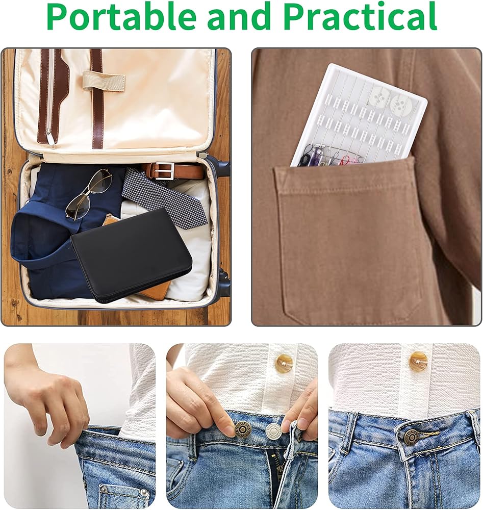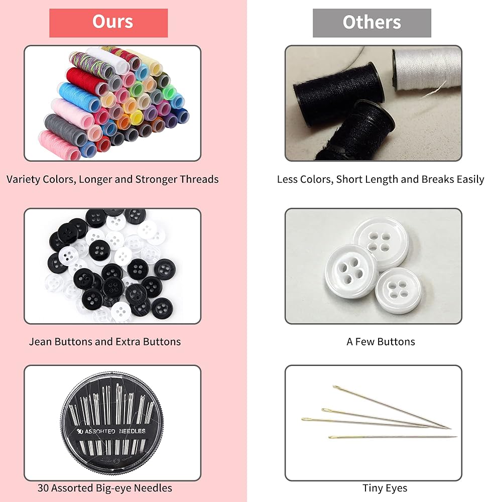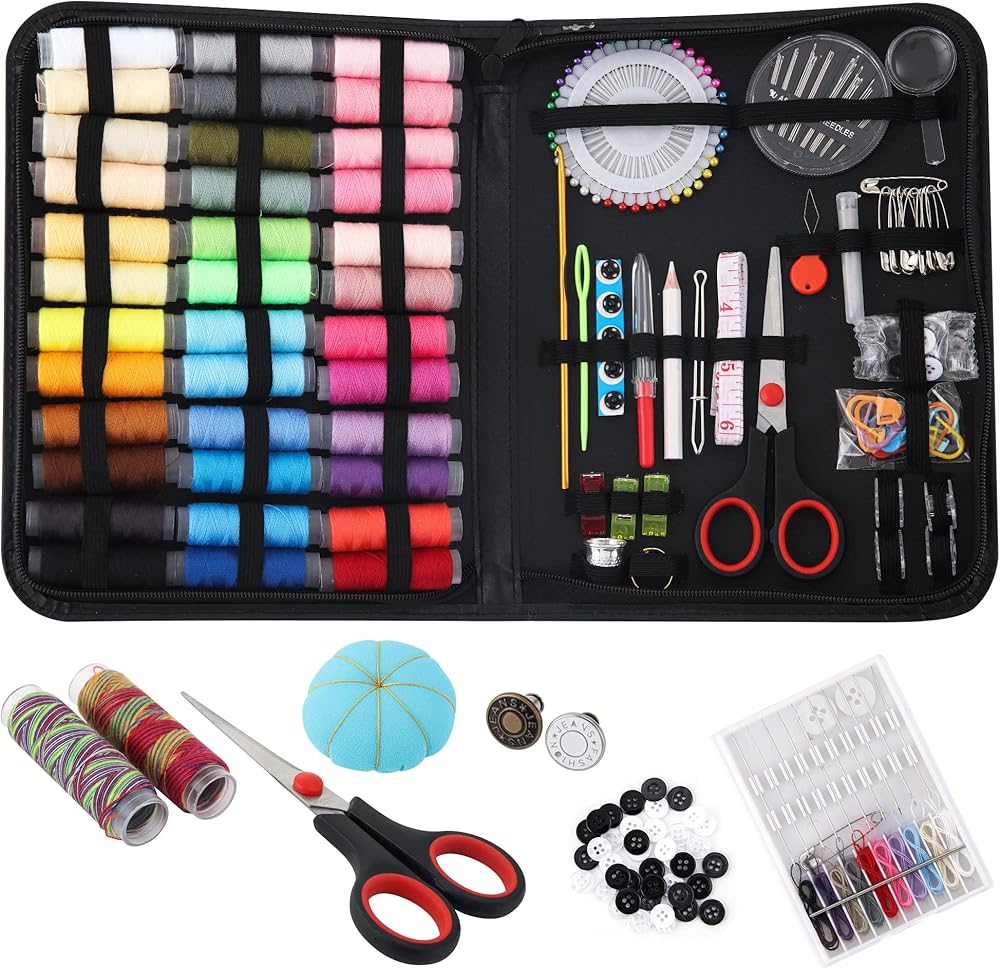 مجموعة كاملة من الإبر والخيوط: تحتوي مجموعة الخياطة المخصصة للسفر هذه على جميع مستلزمات الخياطة التي تحتاجها، بما في ذلك 38 بكرة خيط XL عالية الجودة، وصندوق واحد من مجموعة الإبر الملولبة مسبقًا، و60 زرًا احتياطيًا، ودبابيس أزرار الجينز، وأزرار كبس معدنية، وإبر ، خيط الإبر، وسادة الدبوس، دبابيس الألوان، دبابيس الأمان، خطاف الكروشيه، إبرة الغزل، الكشتبانات، قلم القماش، كسارة التماس، البكرات، مشابك الخياطة، مقص القماش المقاوم للصدأ، بودكين، علامات الغرز، المكبر، شريط القياس، إلخ.