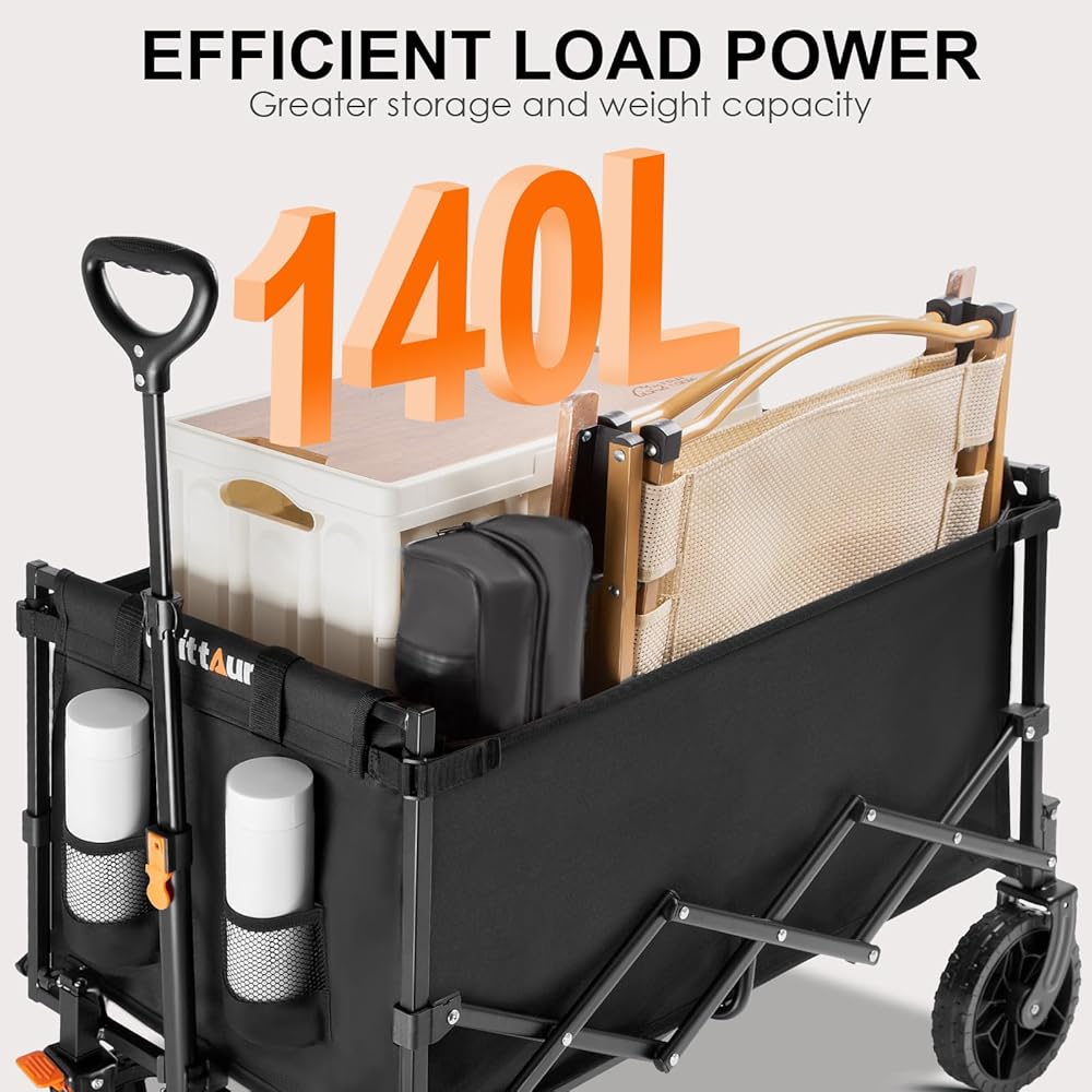 أقصى سعة - المزيد من المفاجآت: في Uyittour، تأكدنا من أن عربتنا القابلة للطي لا تتنازل عن السعة. في الواقع، تتمتع عربتنا بسعة أكبر بنسبة 30% من العربات الأخرى ذات الحجم القياسي، حيث تصل إلى 140 لترًا. وقد قمنا بتضمين حاملي أكواب يمنحك مساحة أكبر لضرورياتك. استعد لحزم كل شيء وابدأ الطريق بثقة!