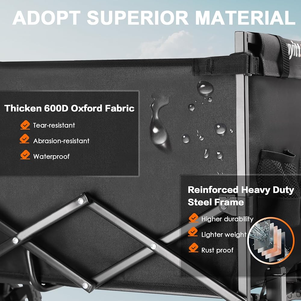 طول العمر الاستثنائي - صُممت لتدوم طويلاً: تم تصميم عربتنا القابلة للطي لتتحمل حتى أصعب المغامرات الخارجية. يمكن للإطار الأنبوبي الفولاذي عالي القوة أن يحمل ما يصل إلى 220 رطلاً، وهو مصمم ليكون مقاومًا للصدأ والبهتان. قماش أكسفورد السميك 600d مقاوم للتمزق وسهل التنظيف، مما يجعله مثاليًا للاستخدام في الهواء الطلق. بفضل بنيتها المتينة، يمكنك أن تتوقع أن تخدمك هذه العربة القابلة للطي بشكل جيد لفترة طويلة.