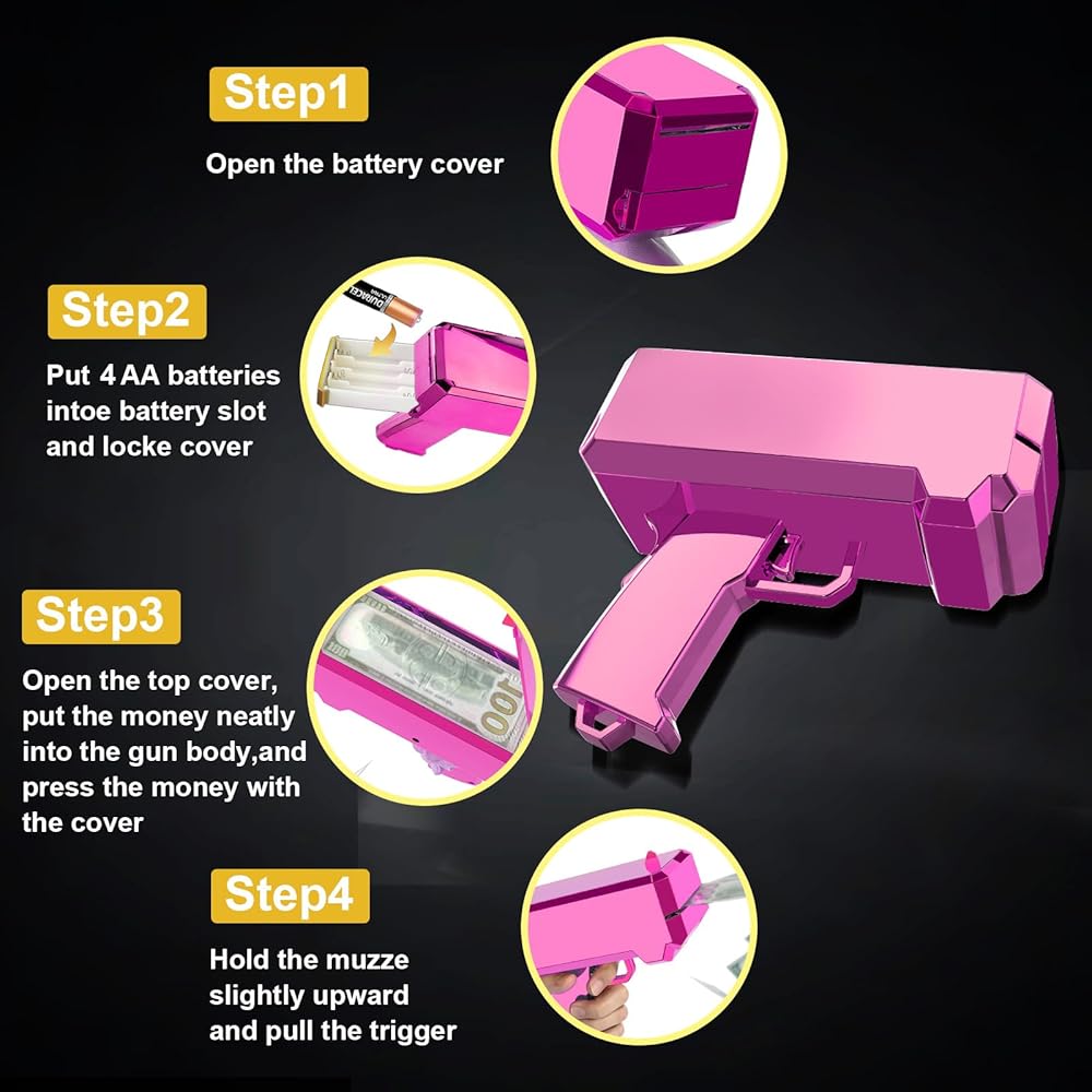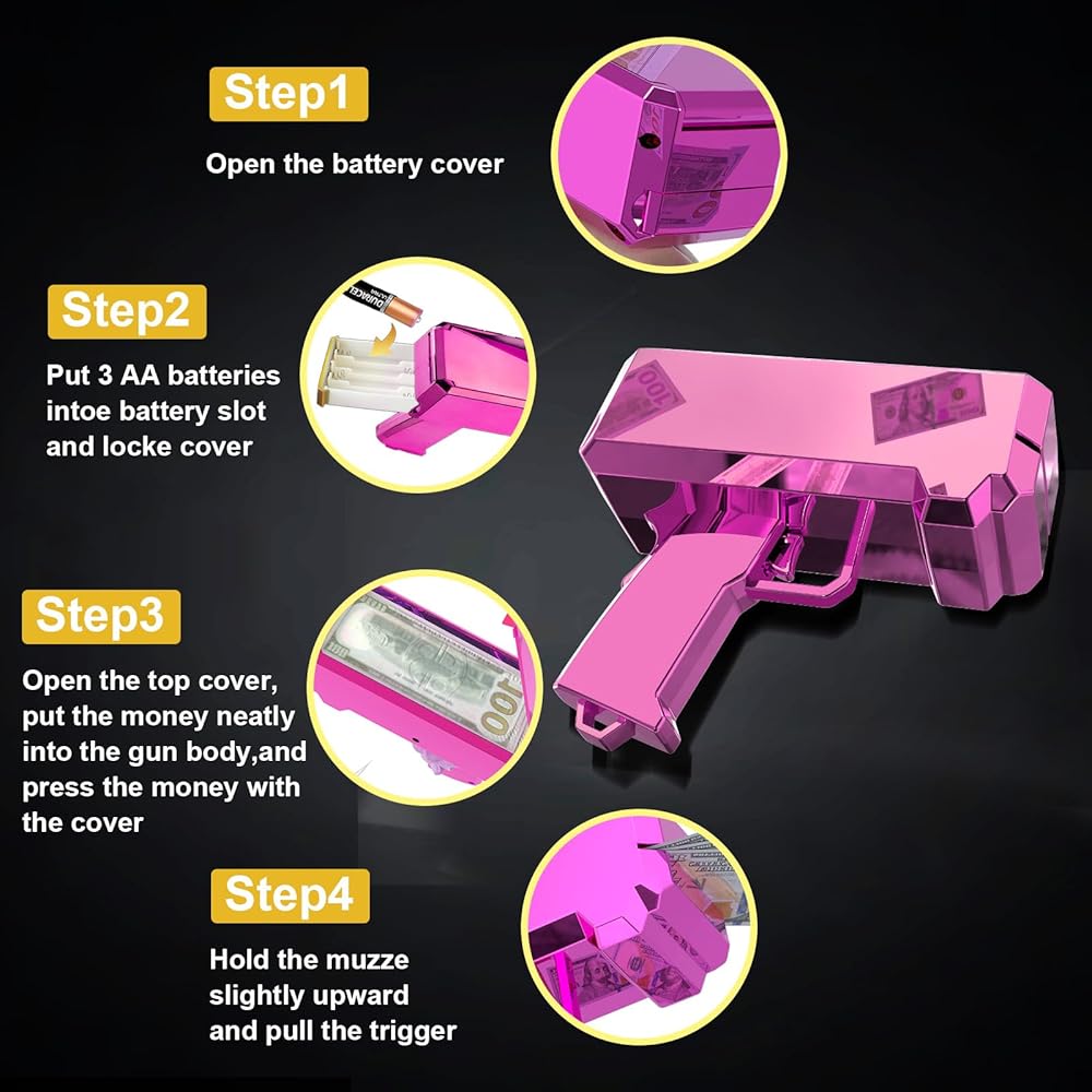 [سهل الاستخدام]: يحتوي مسدس النقود على محرك أقوى حتى يتمكن من إطلاق النقود بالكامل بسلاسة وبمعدل سريع. كما أنه سهل الاستخدام. قم بتركيب 4 بطاريات AA في الجانب الأيمن من البندقية قبل الاستخدام. ارفع الغطاء وأدخل أوراق اللعب أو انسخ النقود، ثم اضغط على الغطاء داخل الجسم، ووجه البندقية قليلاً نحو السماء واضغط على الزناد في دفعات صغيرة. سوف تأتي الأموال المحملة تطير. إذا تم إطلاق مسدس النقود نحو الأسفل، فقد تتراكم الأموال وقد لا تخرج بشكل جيد.