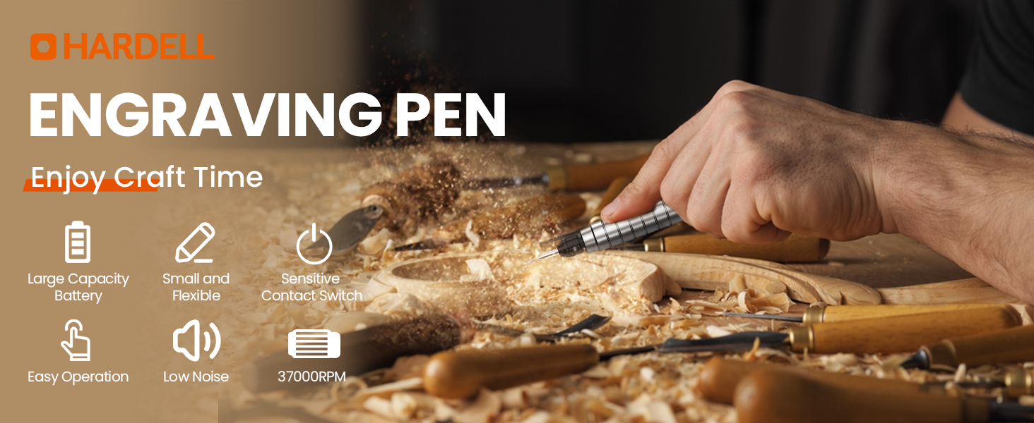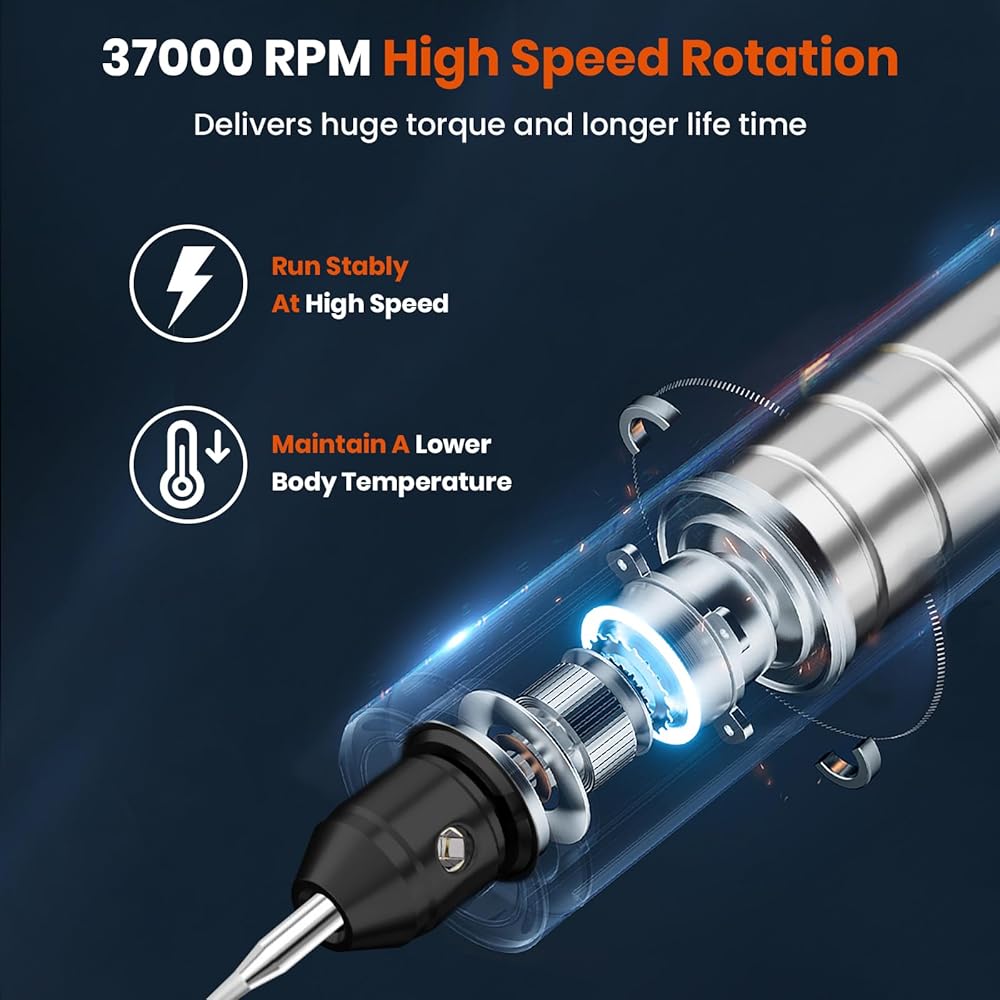 【Powerful Power】This electric pen has a 37,000 RPM motor, the motor runs stably at high speed, and it is not easy to heat up for a long time. Pen-type push switch, pen press, sensitive contact switch, easy to operate.