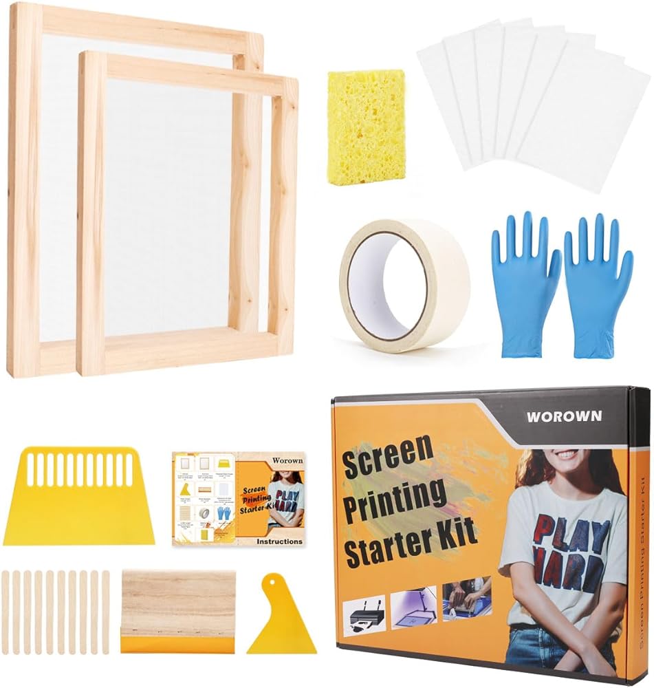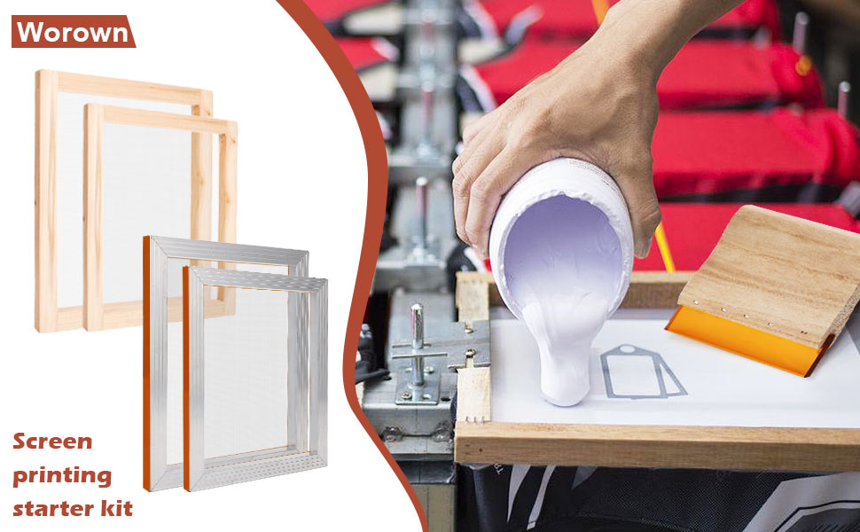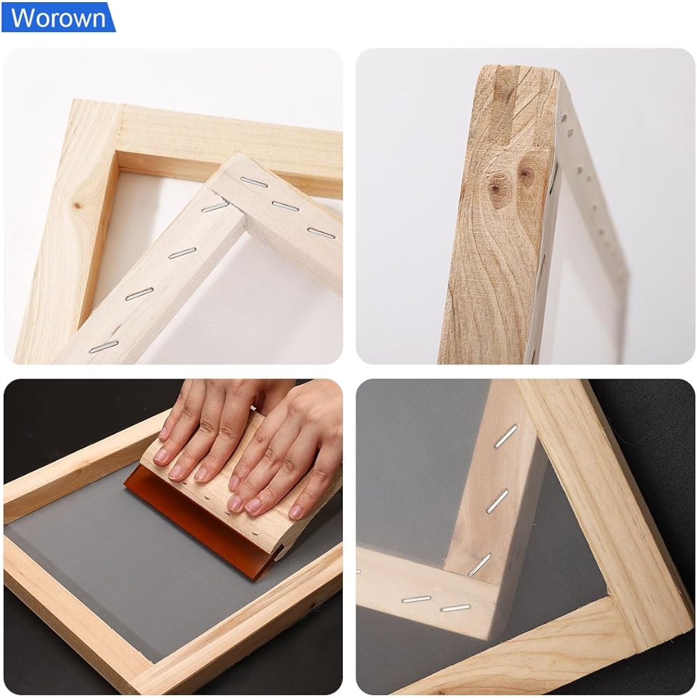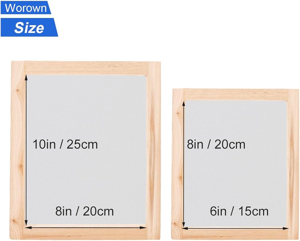 مجموعة أدوات بدء طباعة الشاشة من Worown مكونة من 24 قطعة، حجمين مختلفين من إطار طباعة الشاشة الخشبية مع 110 شبكة بيضاء، بما في ذلك الممسحات وفيلم الشفافية النافثة للحبر والعصي الخشبية وشريط الإخفاء