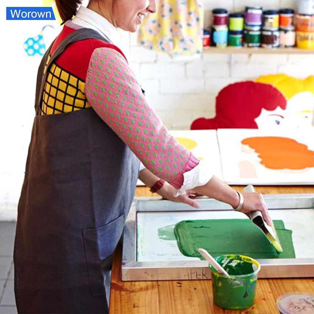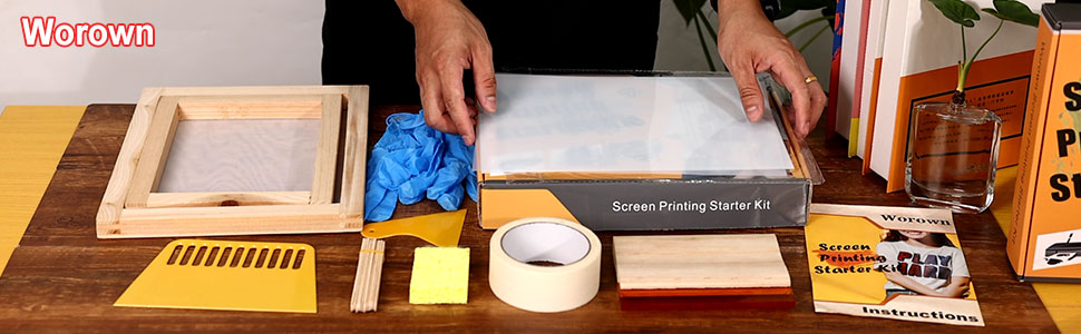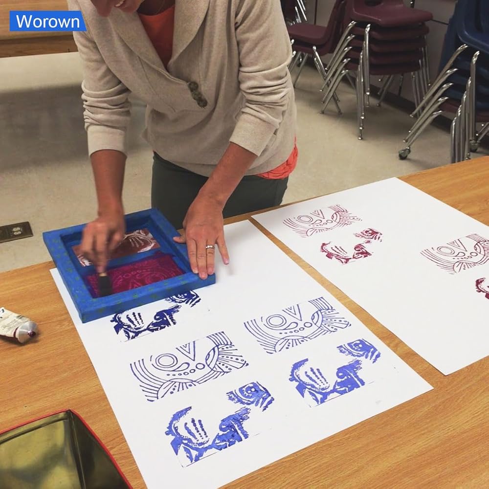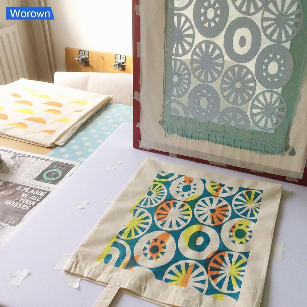 مجموعة أدوات بدء طباعة الشاشة من Worown مكونة من 24 قطعة، حجمين مختلفين من إطار طباعة الشاشة الخشبية مع 110 شبكة بيضاء، بما في ذلك الممسحات وفيلم الشفافية النافثة للحبر والعصي الخشبية وشريط الإخفاء