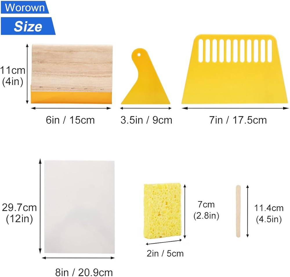 الملحقات العملية: 5 قطع من أفلام الشفافية مقاس A4 لنقل أنماطك بفعالية. بالإضافة إلى ذلك، 10 قطع من العصي الخشبية بقياس 4.49 بوصة مثالية لخلط ونقل الحبر والمستحلب. يضمن الشريط اللاصق الحماية المثلى لإطار الشاشة وتأثير الطباعة المثالي. يتم تضمين إسفنجة واحدة للمساعدة في إزالة الماء الزائد بعد التنظيف، وزوج من القفازات سيحمي يديك من الحبر