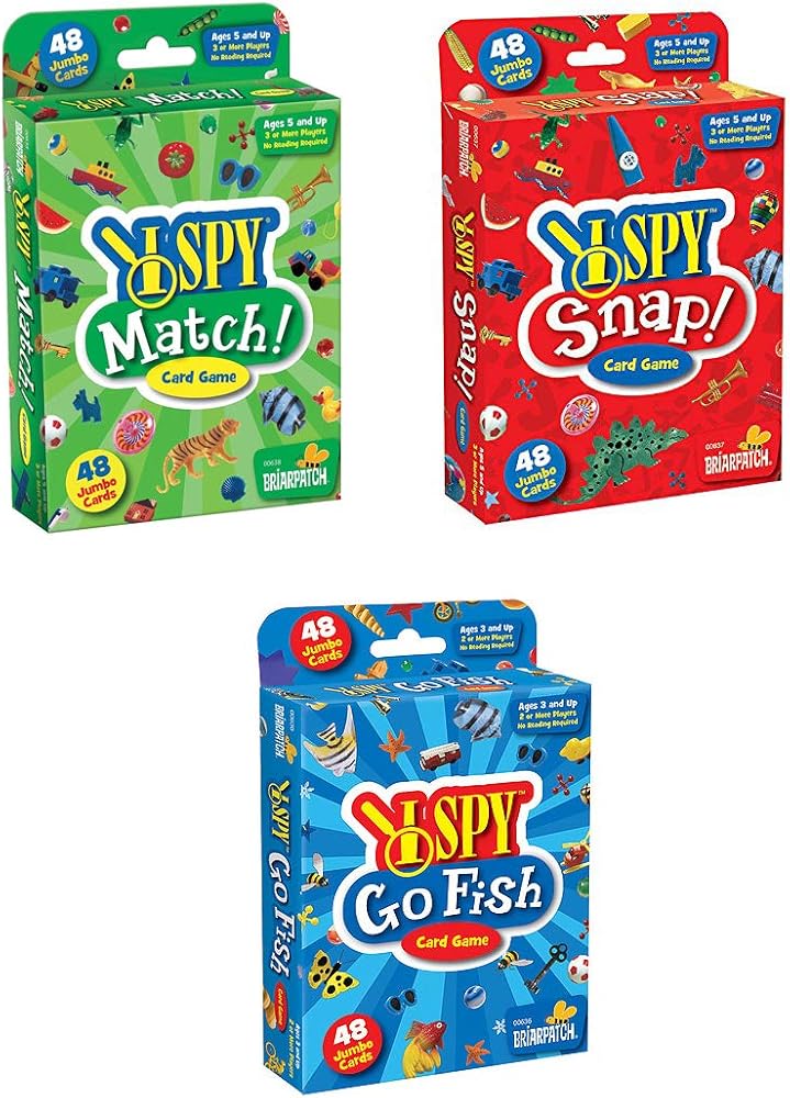 I SPY Match!؟ أنا أجسس حصان ونظارات شمسية أيضًا. اعثر على المباراة وهو الفائز لك! يحاول اللاعبون تذكر أين توجد كل بطاقة وجمع أكبر قدر من المباريات. زوج من البطاقات اللتين لهما نفس الكائن المركزي I SPY Snap! آي سباي سناب تضفي لمسة على لعبة البطاقات الكلاسيكية. يقوم اللاعبون بتحويل بطاقة واحدة في كل مرة. إذا رأيت مباراة بين البطاقات التي تم تحويلها، فستكون أول من يدعى اسم الأشياء! اللاعب مع معظم البطاقات يفوز. أنا SPY Go Fish? في هذا التنوع من لعبة البطاقات الكلاسيكية، تضيف صور آي سباي المحبوبة تطورًا جديدًا ممتعًا لأطفالك (ولك!) ستحبها.