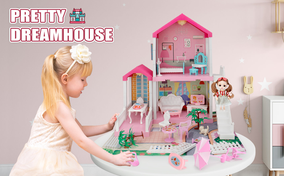 مجموعة بيت الدمية مع العديد من الملحقات - يبلغ طولها 20.3 بوصة وعرضها 19.7 بوصة وتتميز بطابقين و3 غرف بما في ذلك غرفة المعيشة وغرفة الطعام وغرفة النوم وإكسسوارات إضافية بما في ذلك السرير وطاولة الزينة والأرائك والتلفزيون وطاولة الطعام والكراسي ومظلة الفناء والدمية والجراء، يشجع منزل التاون هاوس خيال الشباب على الانتقال إلى بيت الدمى هذا وإنشاء منزل الأحلام.