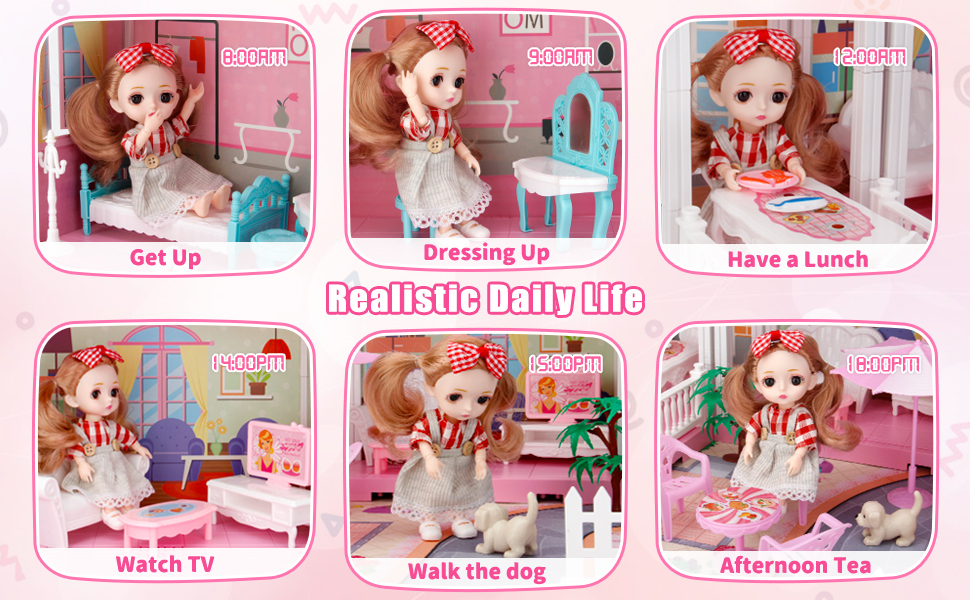 تشجع ملابس وأثاث الدمى على لعب الأدوار - تحفز بيوت اللعب المفروشة بالكامل اللعب التخيلي الخيالي للسماح باللعب النشط وسرد القصص. تخيلي أن أميرتك الصغيرة تستيقظ لتفتح النافذة، وترتدي ملابسها، وتتناول الغداء، وتشاهد التلفاز، وتمشي مع كلبها، وتتناول الشاي بعد الظهر، يا لها من حياة يومية واقعية وصحية! يمكن لدميتنا المطورة ذات المفاصل المتعددة محاكاة حركة الإنسان بسلاسة.