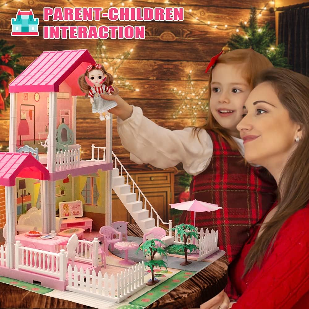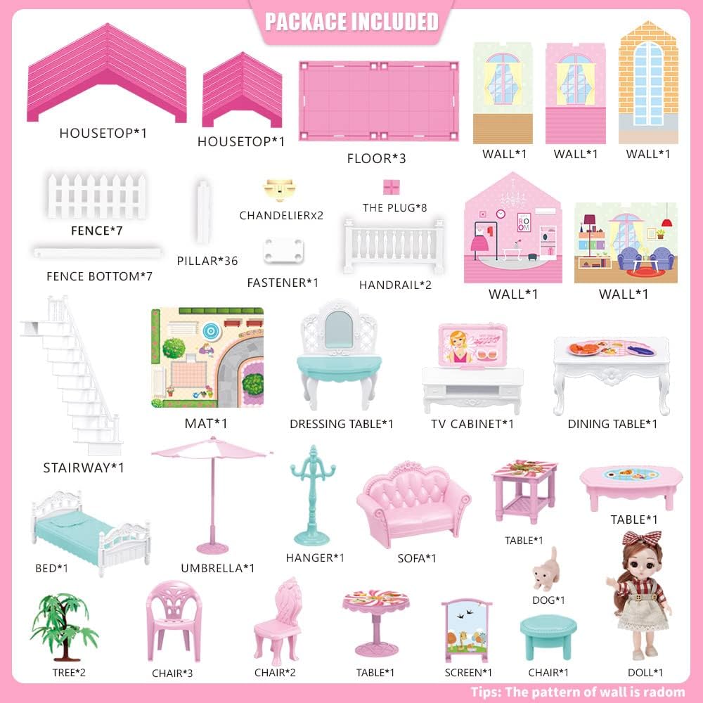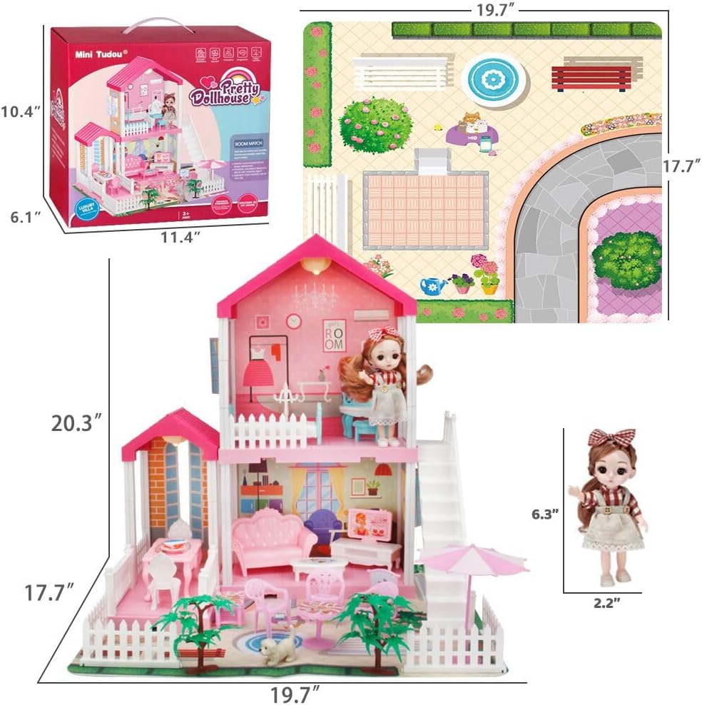 بيت الدمى الصغير تودو للفتيات، بيت الدمية مع أضواء، بساط اللعب والدمى، بناء منزل اللعب التظاهري مع إكسسوارات الأثاث والأدوات المنزلية، بيت لعب للفتيات 3-12 (3 غرف)