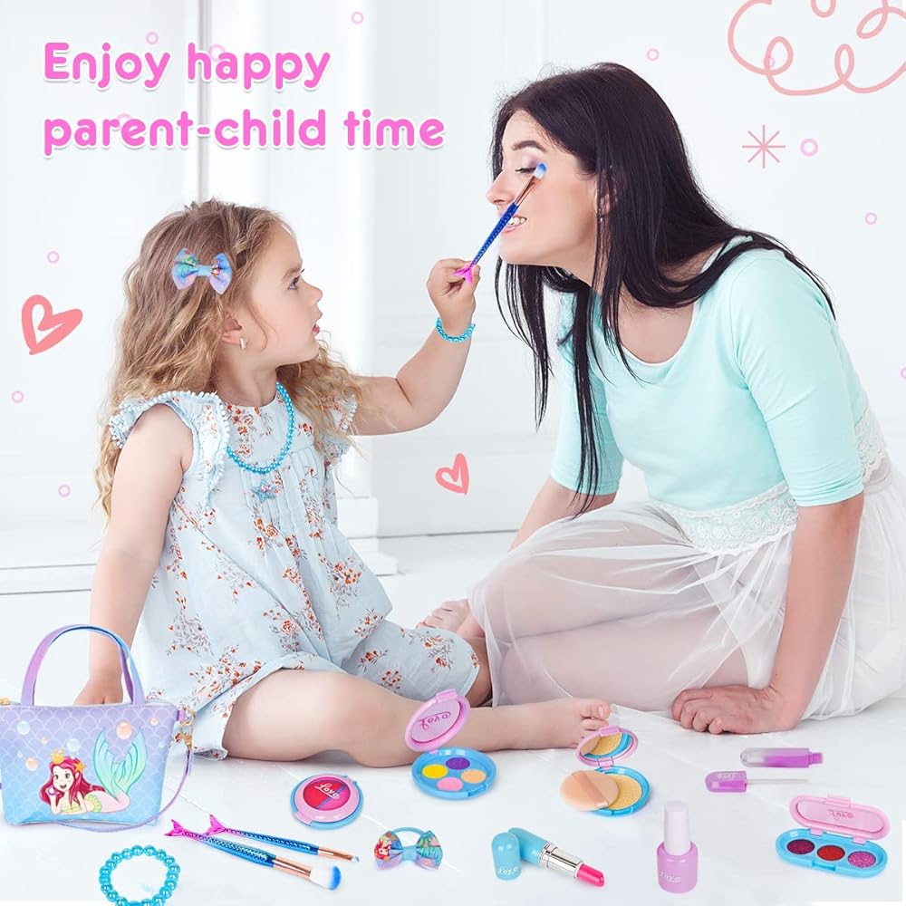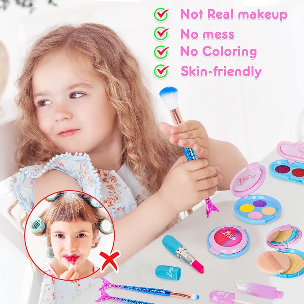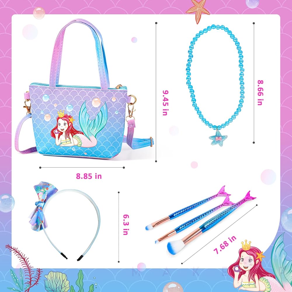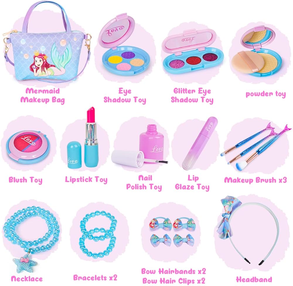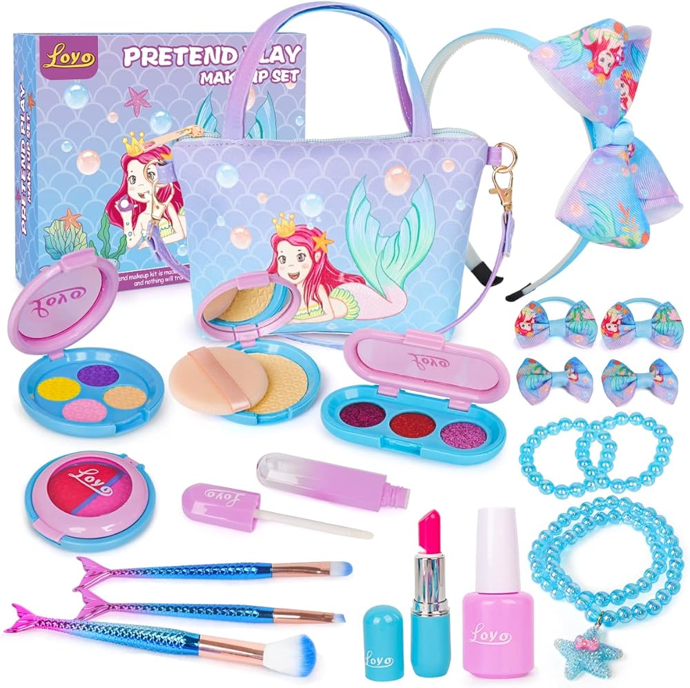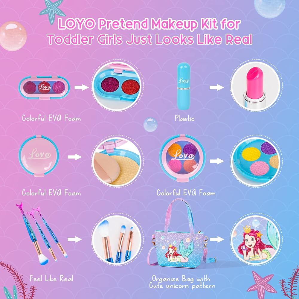 مكياج لويو التظاهري للأطفال الصغار - مكياج اللعب التظاهري للفتيات الصغيرات مع محفظة حورية البحر، مجموعة ألعاب مكياج وهمية للفتيات الصغيرات بعمر 3 4 5 6 هدية عيد ميلاد عيد الميلاد