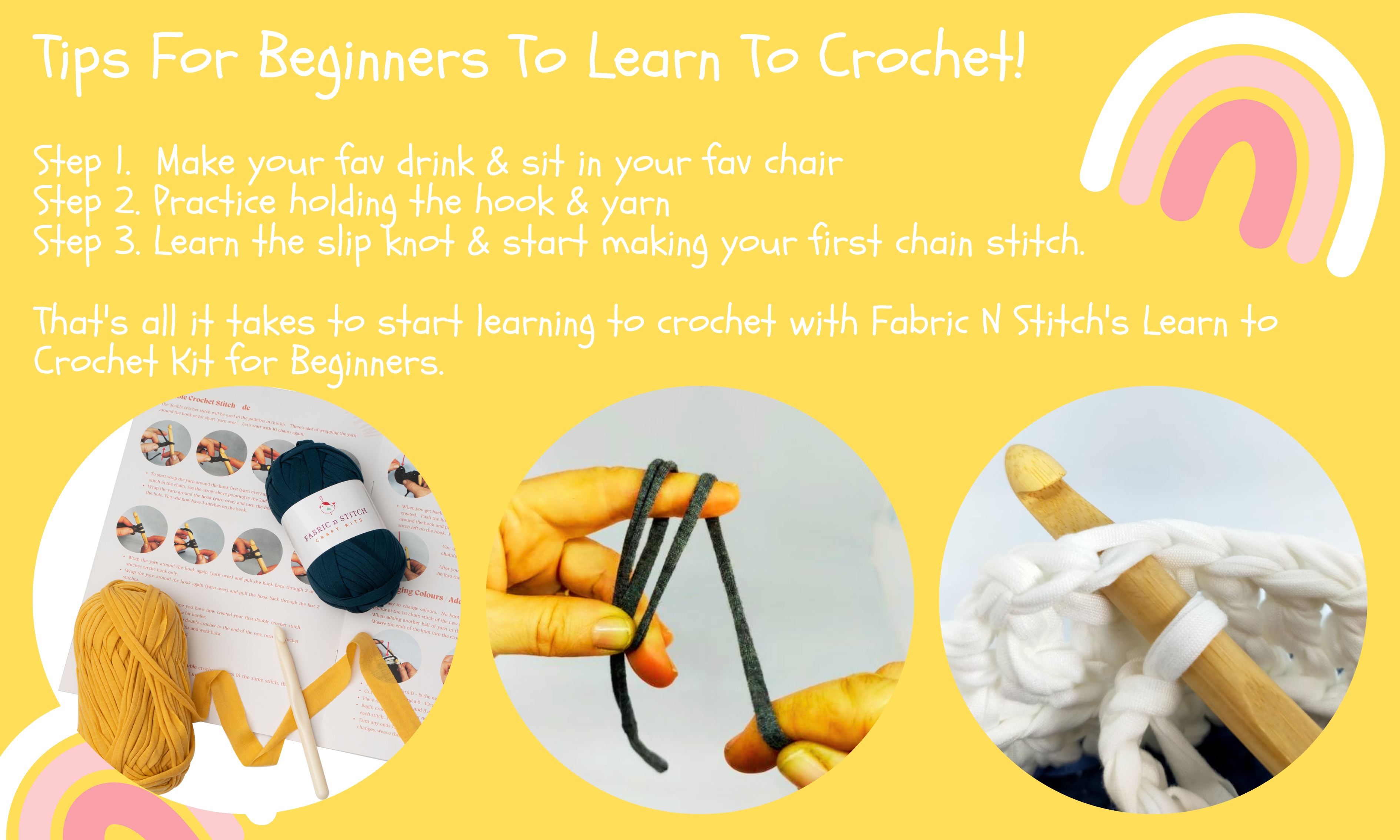 تعلم كيفية الكروشيه مع خيوط تي شيرت في مجموعة الكروشيه هذه للمبتدئين. تتضمن كل ما تحتاجه للبدء بسرعة. إذا كنت مثلي، فإن النظر إلى نمط الكروشيه كان مثل نوع من الرموز السرية وكنت أعتقد دائمًا أنه صعب للغاية. إنه أسهل بكثير مما تعتقد. ابتكرت فابريك ان ستيتش مجموعة الكروشيه للمبتدئين هذه خصيصًا لمساعدتك لأننا نفهم مدى صعوبة البدء. اعتمادًا على كيفية التعلم، هناك صور وتعليمات مكتوبة ومقاطع فيديو تعليمية قصيرة لمساعدتك. إذا واجهتك مشكلة حقًا ، فإن الدعم هنا إذا كنت بحاجة إليه. ابتكر 3 تصميمات عملية بنمط بوهيمي للاستخدام في جميع أنحاء منزلك. ابدأ بقواعد الأكواب لتعلم الغرز الأساسية، ثم جرب حقيبة اليد قبل إنشاء حقيبة كتفك. يمكنك اختيار نمط اللون الذي ترغب في الحصول على المظهر الذي تريده. العمل مع خيوط التيشيرت أسهل من الصوف لأنه يحافظ على هيكله مما يجعل من السهل العثور على كل غرزة، وهو ناعم ومكتنز مما يجعل تصميمك ينمو بسرعة وسهولة قابل للغسل. مع 10 كرات من خيوط التيشيرت بألوان متعددة، 2 خطاف كروشيه خشبي، 3 علامات غرز وكتيب تعليمات ملون من 16 صفحة، سيكون لديك الكثير من المرح لتعلم الكروشيه. مجموعة الكروشيه للمبتدئين مثالية للأعمار من 13 سنة فما فوق الذين يرغبون في تعلم فن الكروشيه. هدية رائعة. تعلم مجموعات الكروشيه للمبتدئين البالغين.