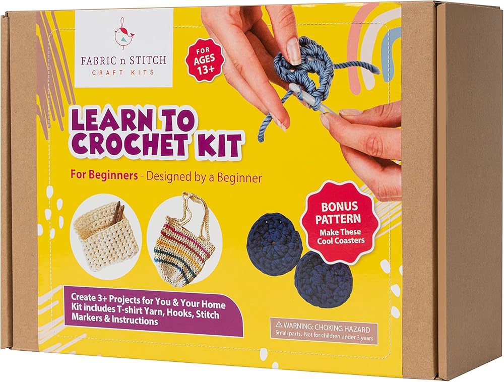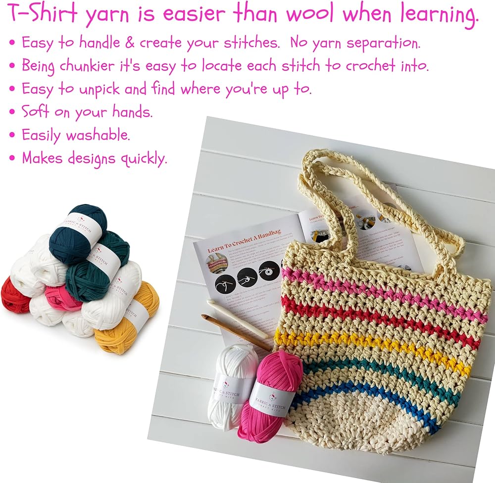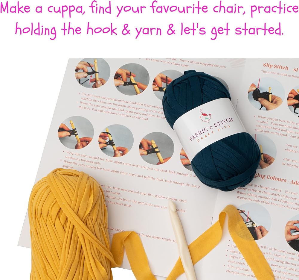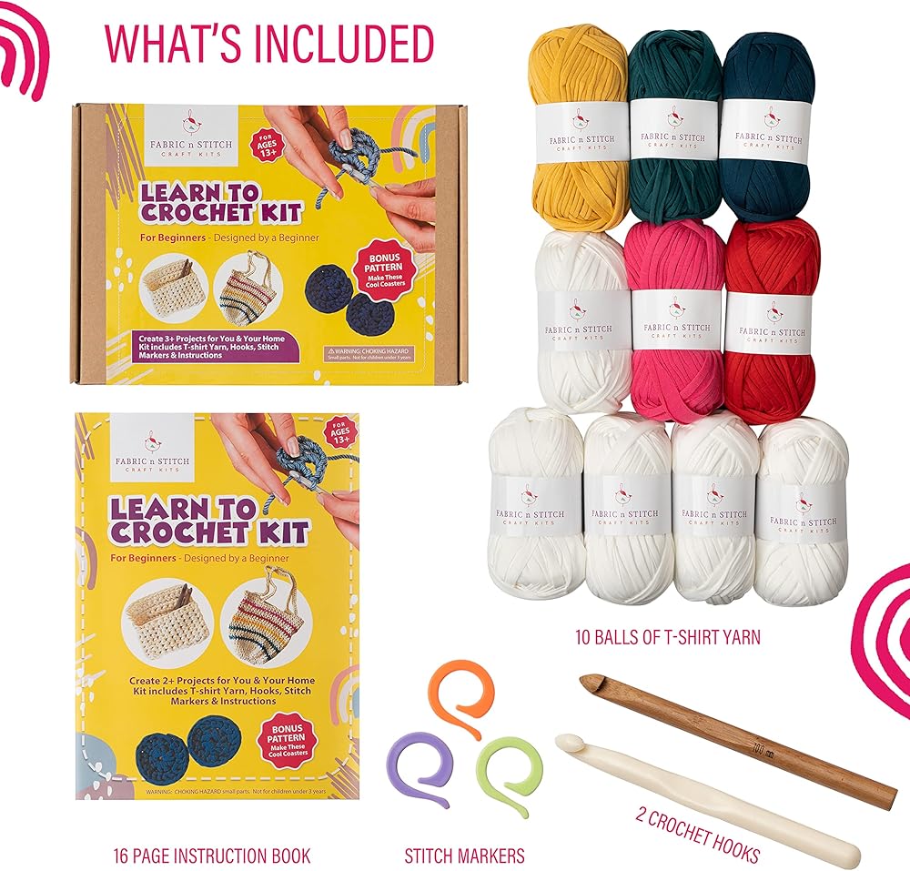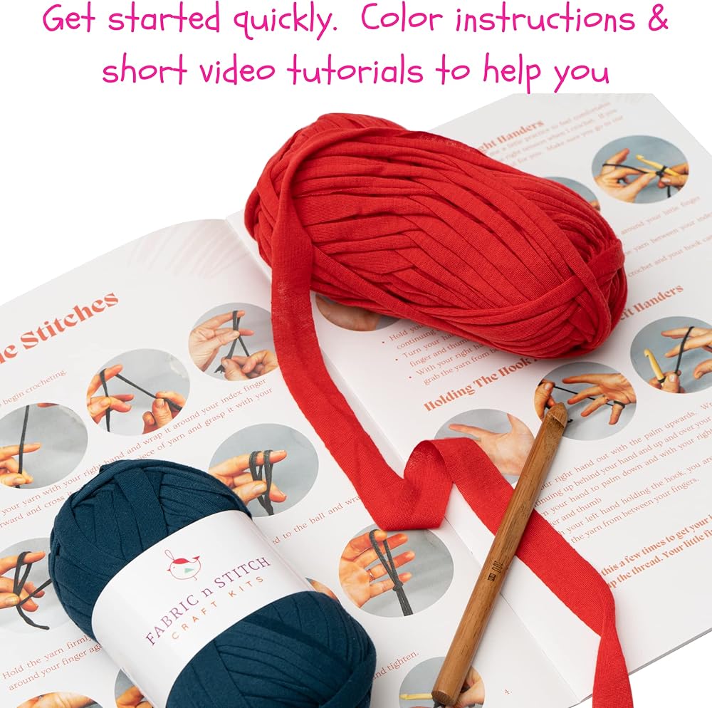 • ابدأ بسهولة. تحتوي مجموعة الكروشيه للمبتدئين هذه على كل ما تحتاجه وتتضمن كتاب تعليمات ملون من 16 صفحة مع مقاطع فيديو تعليمية قصيرة، و10 ألوان مختلفة من خيوط التيشيرت، وخطافين كروشيه وعلامات غرز.