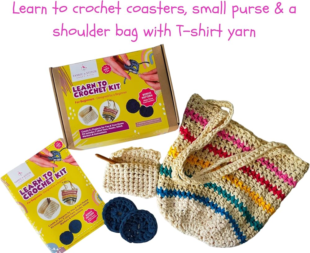 مجموعة تعلم الكروشيه للمبتدئين مع خيوط تي شيرت. ابدأ بسرعة وسهولة. ابتكر 3 تصميمات بنمط بوهو. حقيبة كتف ومحفظة وقواعد أكواب. تعليمات ودروس فيديو للبدء.