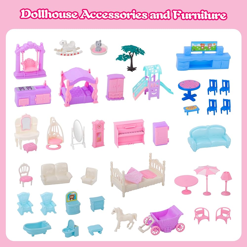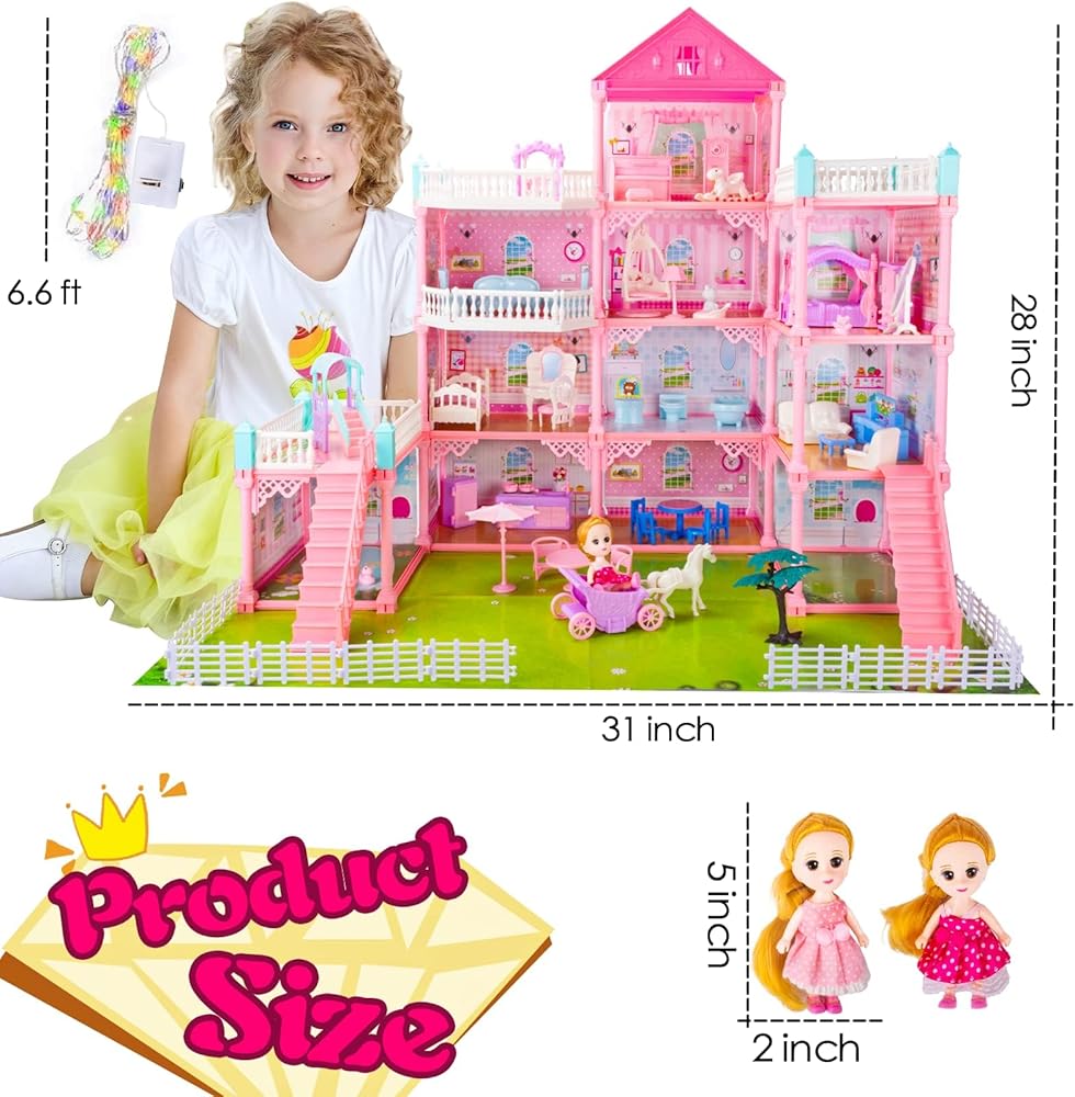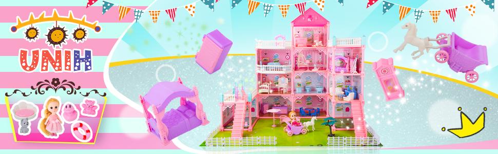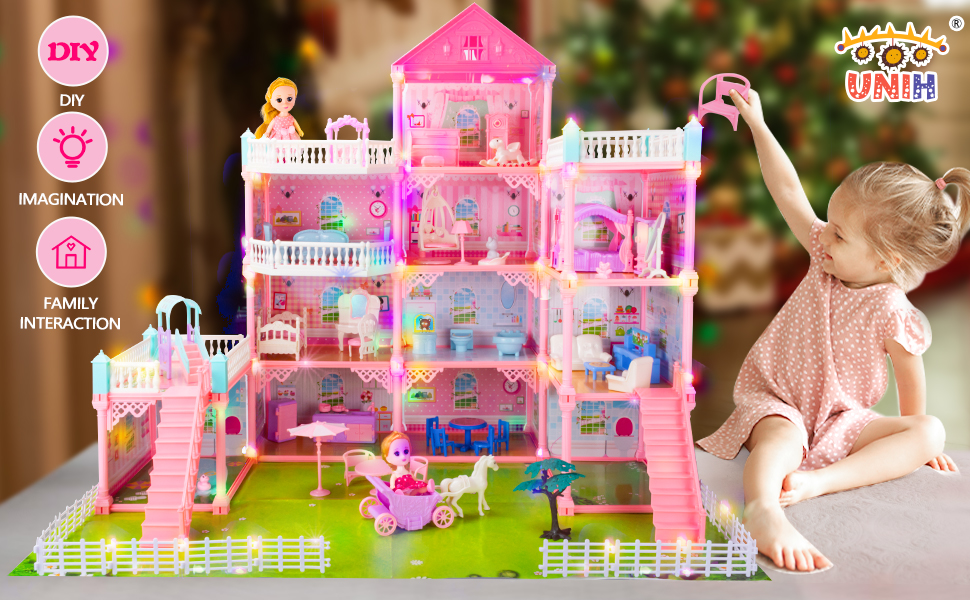 UNIH بيت الدمية ألعاب الفتيات، 4 طوابق 11 غرفة مسرح مع 2 دمى أرقام لعبة مع الضوء، والاكسسوارات، والأثاث التظاهر لعب هدية اللعب للفتيات 3 4 5 6 7 سنوات من العمر