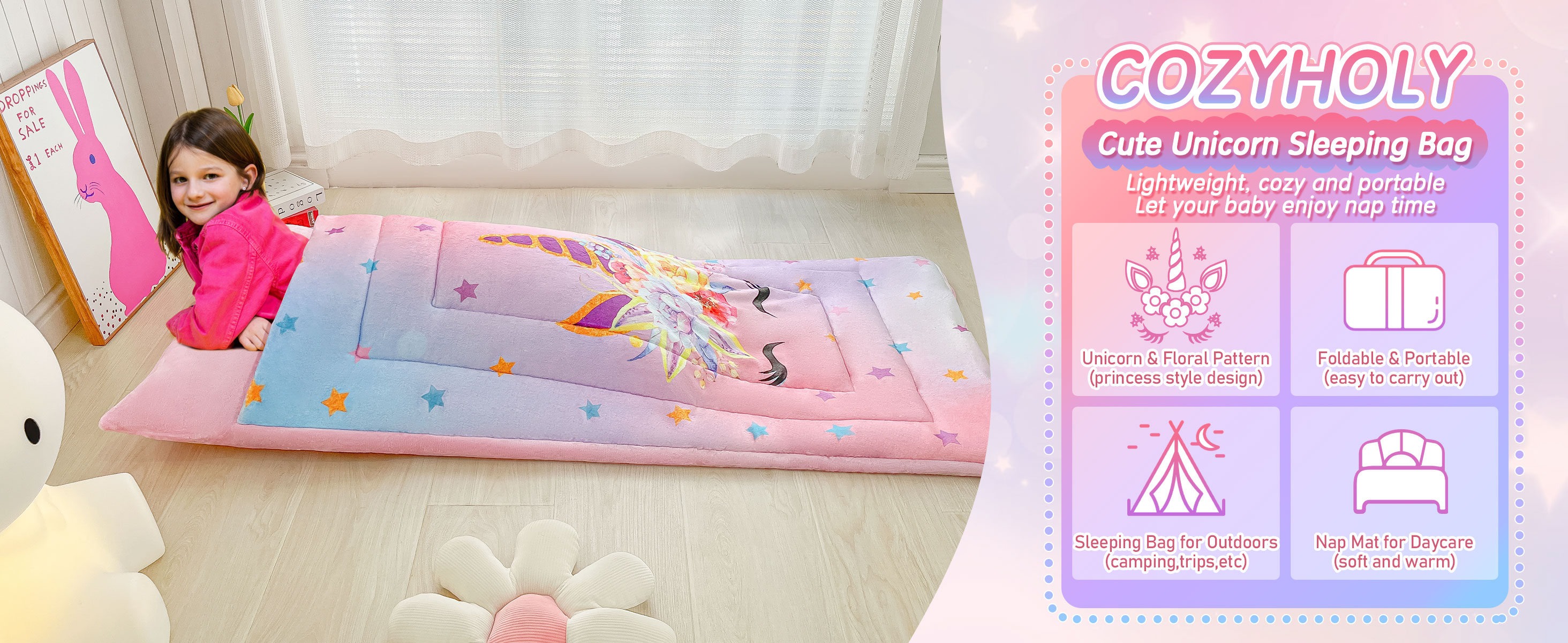 🦄أكياس نوم يونيكورن ستار - تم تصميم حقيبة نوم الأطفال الناعمة خفيفة الوزن هذه مع زهور يونيكورن لامعة ونجوم، مع خلفية باللون الوردي والأرجواني والأزرق، تبدو فريدة وحالمة، إنها حقيبة نوم على طراز الأميرة للفتيات الصغيرات.