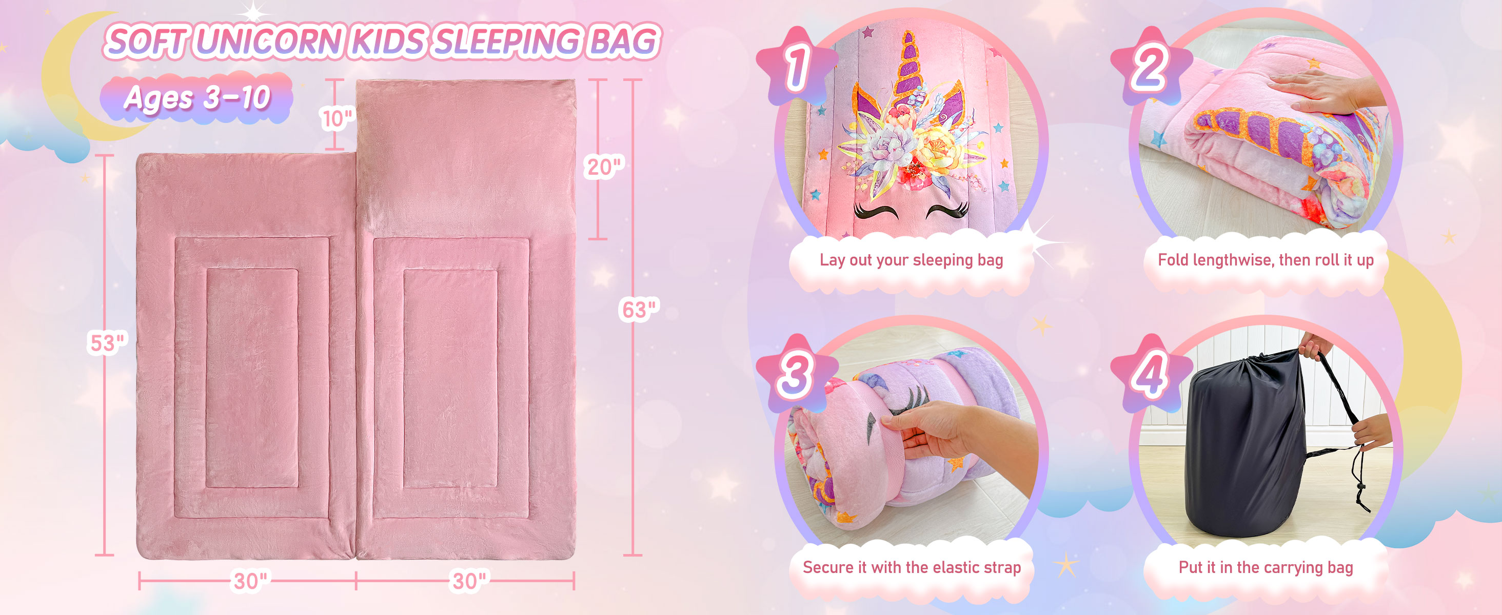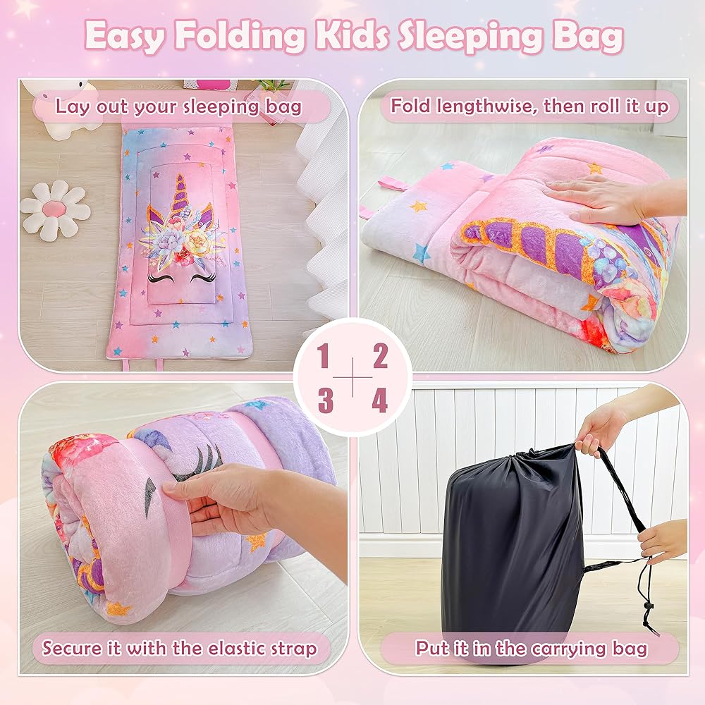 🦄 أبعاد حقيبة النوم - 63 × 30 بوصة (160 × 75 سم)، حقيبة نوم للأطفال مع حقيبة حمل، كاملة مع سحاب إغلاق وجيب وسادة بسحاب، وحقيبة حمل خفيفة الوزن برباط، وهي مثالية لحفلات النوم والرعاية النهارية، والذهاب إلى المدرسة، ورحلات نهاية الأسبوع. أو حفلات بيجامة.