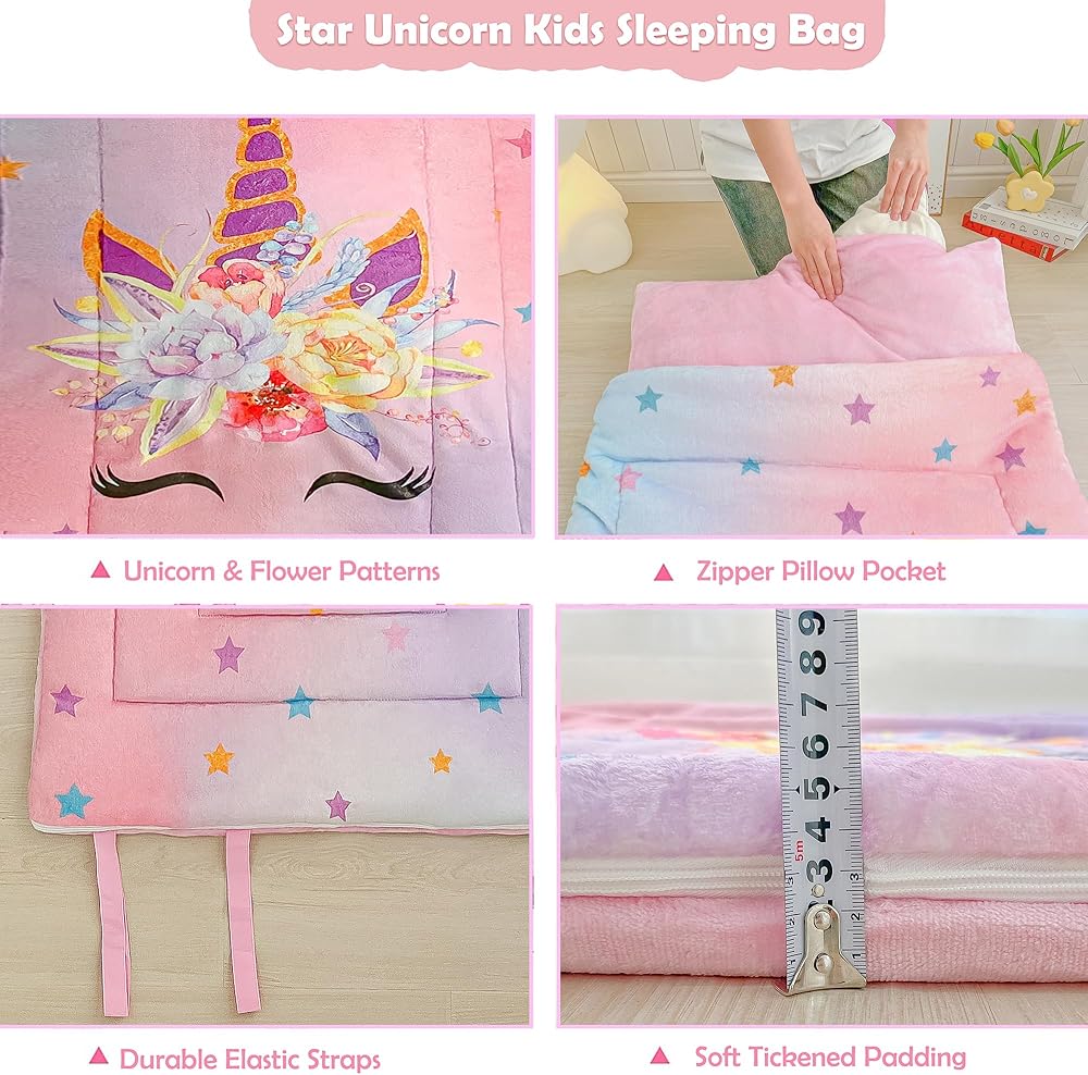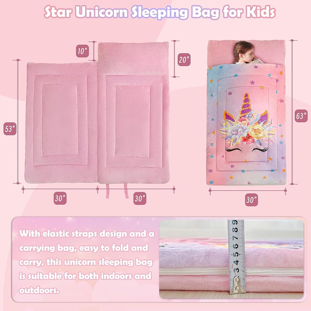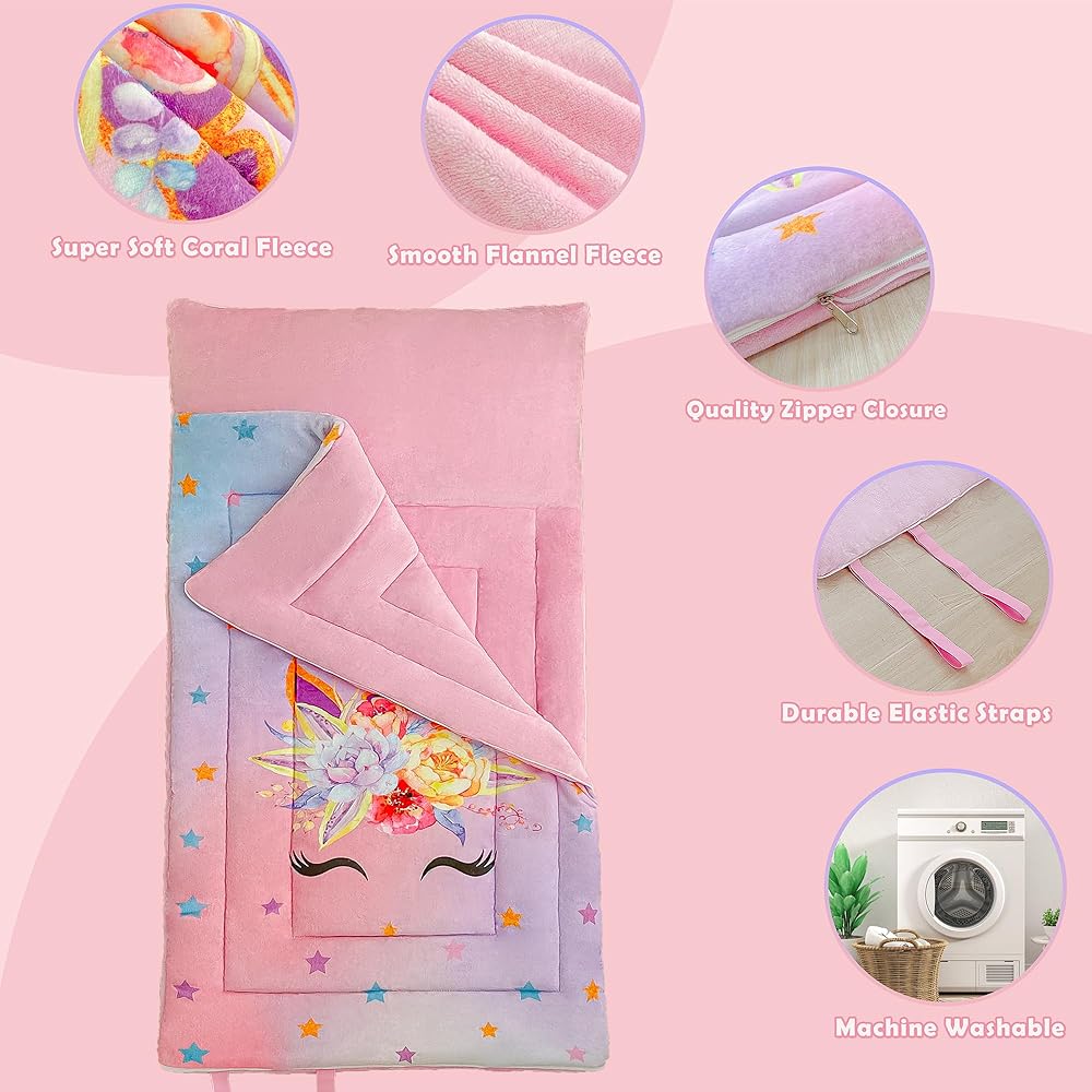 حقيبة نوم للأطفال، حقيبة نوم، حصيرة قيلولة لمرحلة ما قبل المدرسة، سجادة نوم للرعاية النهارية للفتيات، أكياس نوم وردية بنمط وحيد القرن ونجوم قوس قزح، حقيبة نوم خارجية من الفلانيل، صوف ناعم ومريح ودافئ ودافئ وشتوي بارد، أكياس نوم للأطفال الصغار، سجادة نوم، حقيبة نوم وردية، هدايا عيد الميلاد للأطفال، طقم سرير