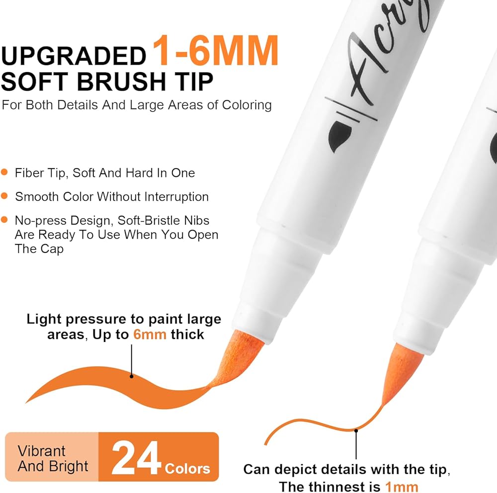 【دقة فائقة لرأس الفرشاة 1-6 مم】تم تصميم قلم الطلاء الأكريليك الخاص بنا بدقة لاستخدام أطراف فرشاة ذات شعيرات ناعمة 1-6 مم لتوفير دقة لا مثيل لها في عملك الفني. توفر الشعيرات الدقيقة والمرنة تحكمًا ممتازًا، عندما ترفع الطرف، يمكنك رسم خطوط دقيقة تصل إلى 1 مم، مثالية لرسم التفاصيل والخطوط الدقيقة؛ عندما تضغط على الطرف بخفة، تحصل على خطوط أكثر سمكًا ويمكن استخدامها لملء مناطق الرسم الكبيرة.