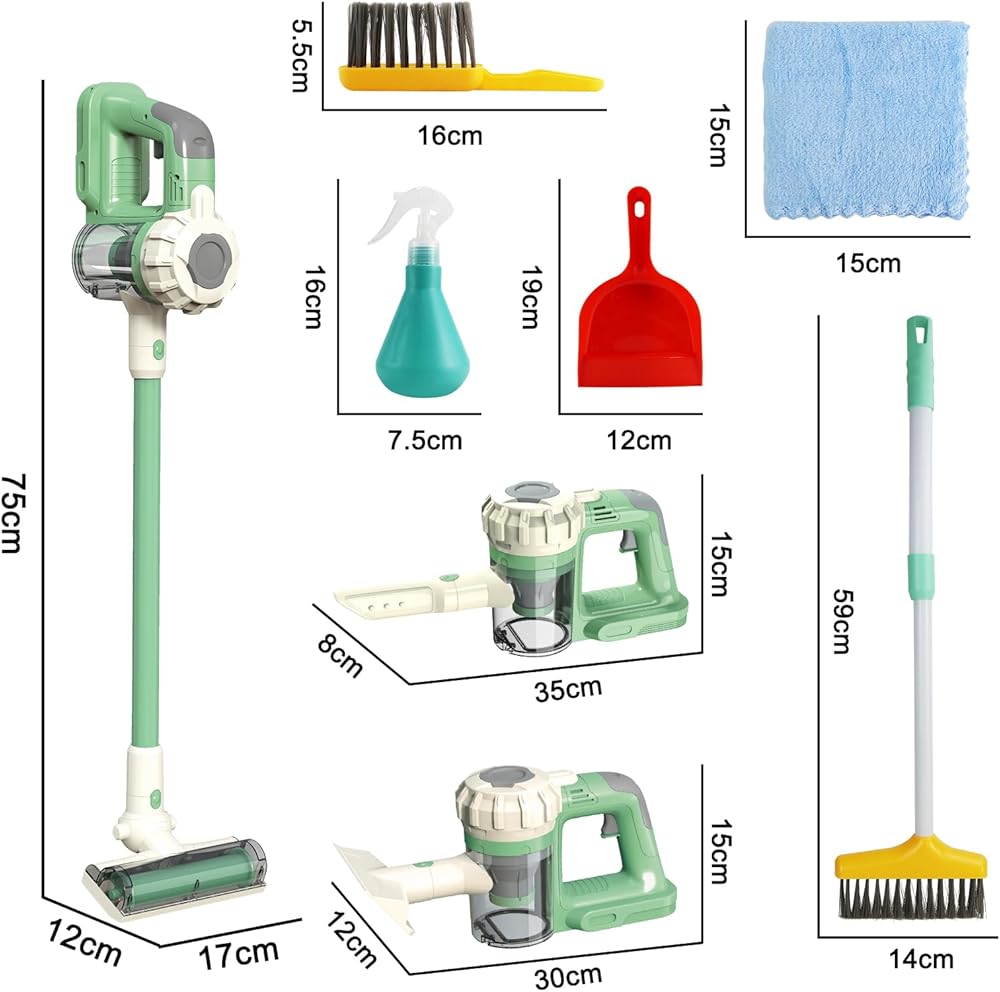 • مكنسة لعبة واقعية: تم تصميم مكنسة اللعبة المتضمنة بمحاكاة عالية لتبدو وتعمل تمامًا مثل الشيء الحقيقي. مع وضعين للعمل و3 فوهات مختلفة يمكن للأطفال استبدالها، يمكنهم تلبية احتياجات التنظيف المختلفة واستخدامها كمكنسة كهربائية أو مكنسة كهربائية محمولة.
