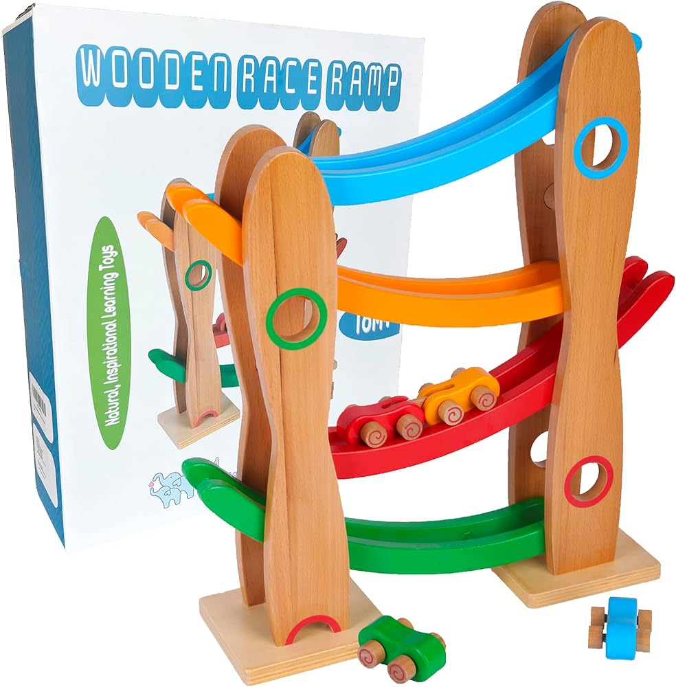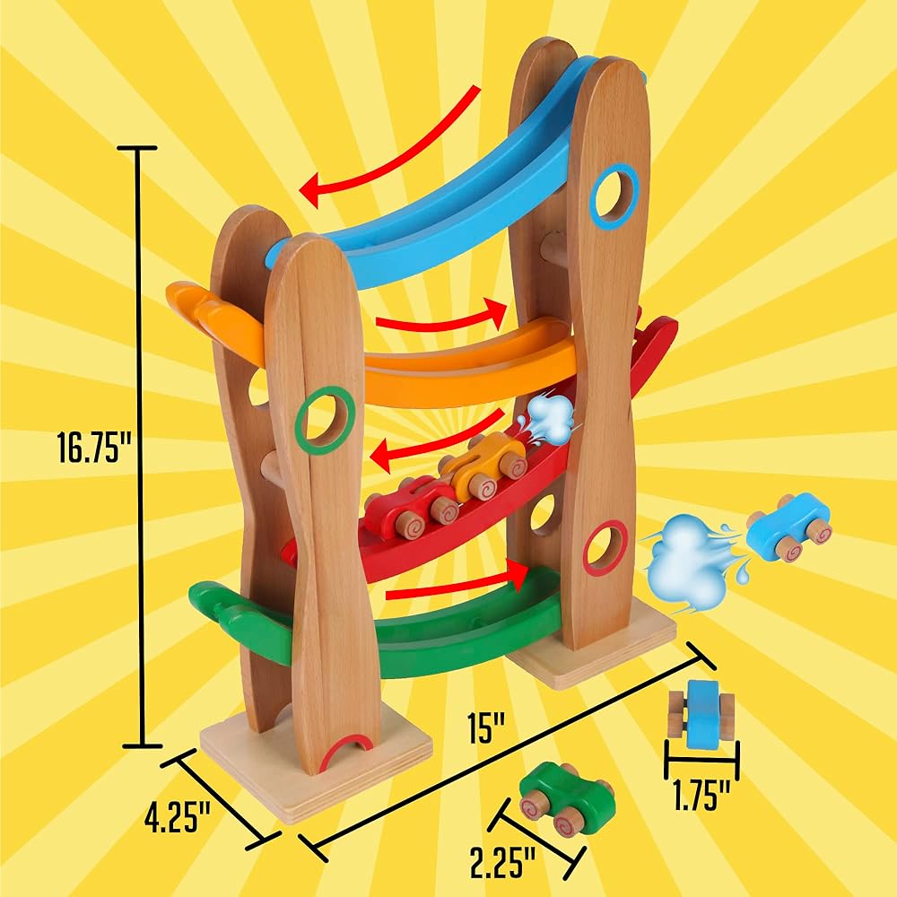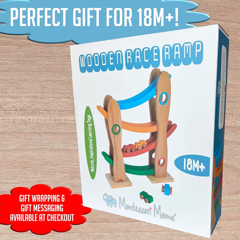 Introducing our Wooden Race Ramp - a beautifully designed, educational cars mini racers toy that combines the timeless charm of wooden toys with the thrill of a high-speed race. Ideal for children aged 18 months and up, this toy is designed to inspire countless hours of fun while promoting cognitive development. Our Wooden Race Ramp is expertly crafted from high-quality, solid wood. This ensures not just longevity but also an eco-friendly alternative to plastic toys. The wood's natural grain, polished to a smooth finish, gives it a delightful tactile feel that kids will love. At the heart of the Montessori Mama philosophy is a focus on education through play. This toy offers an engaging, hands-on way for your little one to explore scientific concepts such as gravity, speed, and cause and effect relationships. It's perfect for stimulating their curiosity, developing fine motor skills and hand-eye coordination, and encouraging independent play. The Wooden Race Ramp features a charming, kid-friendly design with bright, cheerful colours that are sure to captivate your child. With its smooth, rounded edges and non-toxic finishes, you can rest assured knowing your child's safety is our top priority. The set comes with three vibrant racing cars. The track itself is fully assembled and ready to play with right out of the box. Just drop a car at the top, and it's off to the races! One of the delights of the Montessori Mama Wooden Race Ramp is that it makes an exquisite gift. Each race ramp arrives in an elegantly designed, premium box. Whether you're celebrating a birthday, a holiday, or simply want to surprise your little one with a just-because gift, our Wooden Race Ramp is sure to bring joy to their faces. And to make your gift even more special, we offer gift-wrapping and messaging services at checkout. Note: Adult supervision is recommended during play. As with all toys, reguarly check for any signs of wear and remove the toy if damage is found.