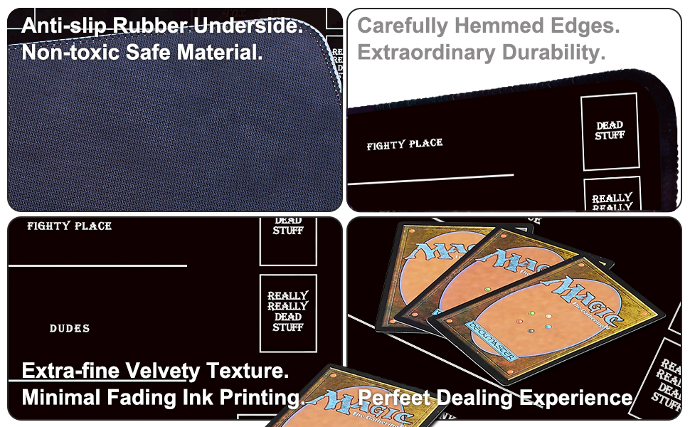 لا تتشقق أو تنزلق: تم تصميم بساط اللعب لمنع التشقق والانزلاق. تعمل الخياطة المتدفقة على تسهيل التعامل مع البطاقات وتحريكها. يضمن السطح الأملس والقاعدة المطاطية المضادة للانزلاق بقاء بطاقاتك في مكانها أثناء اللعب.