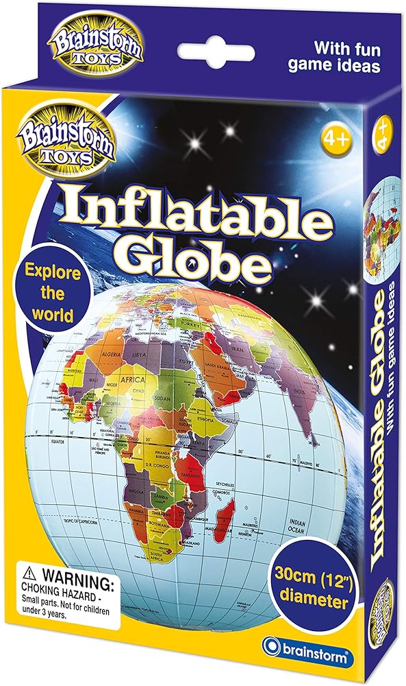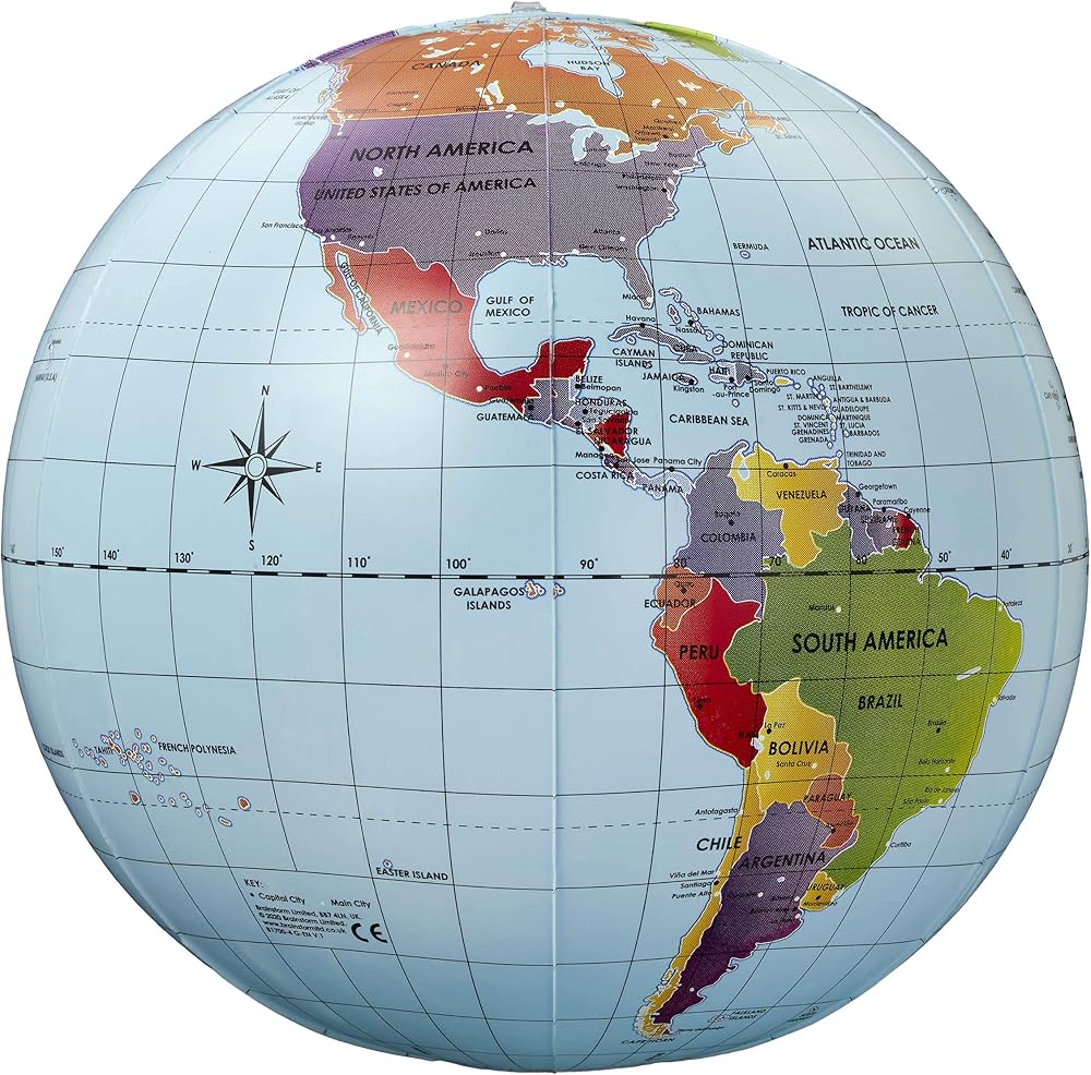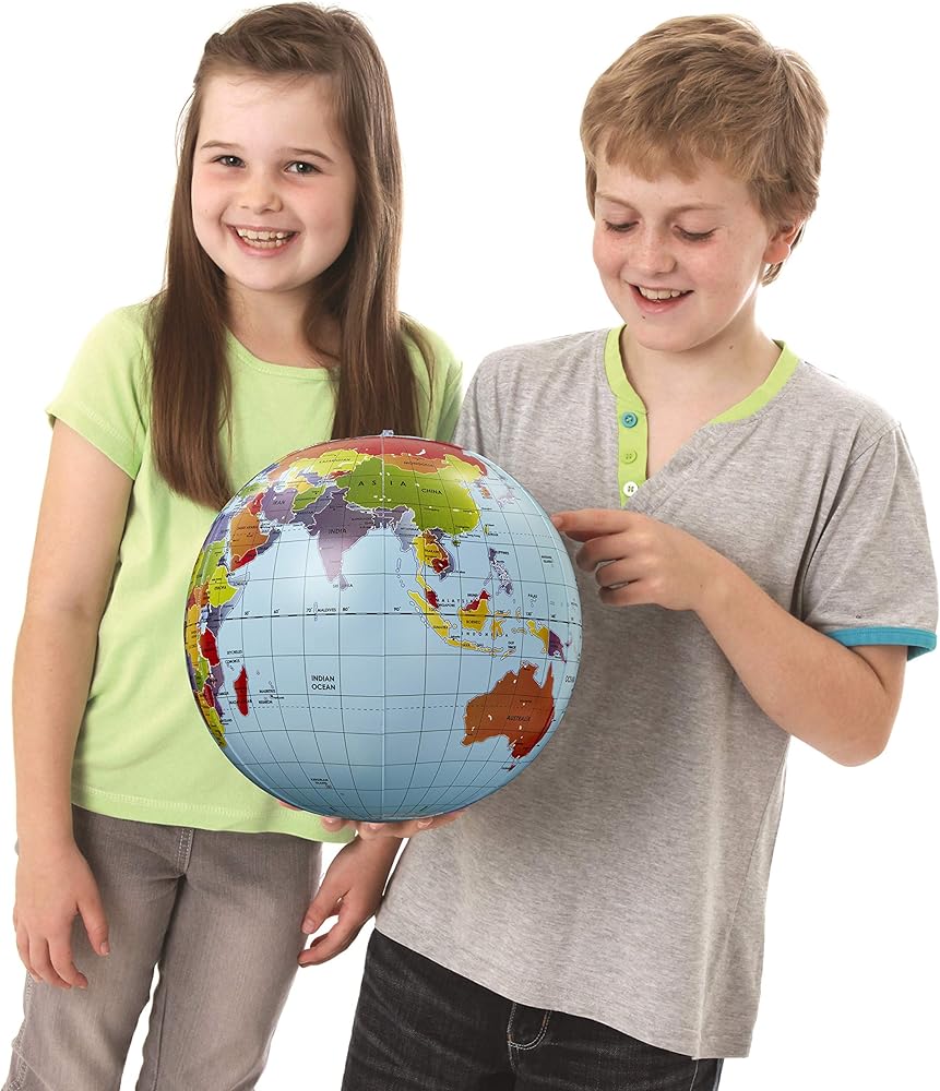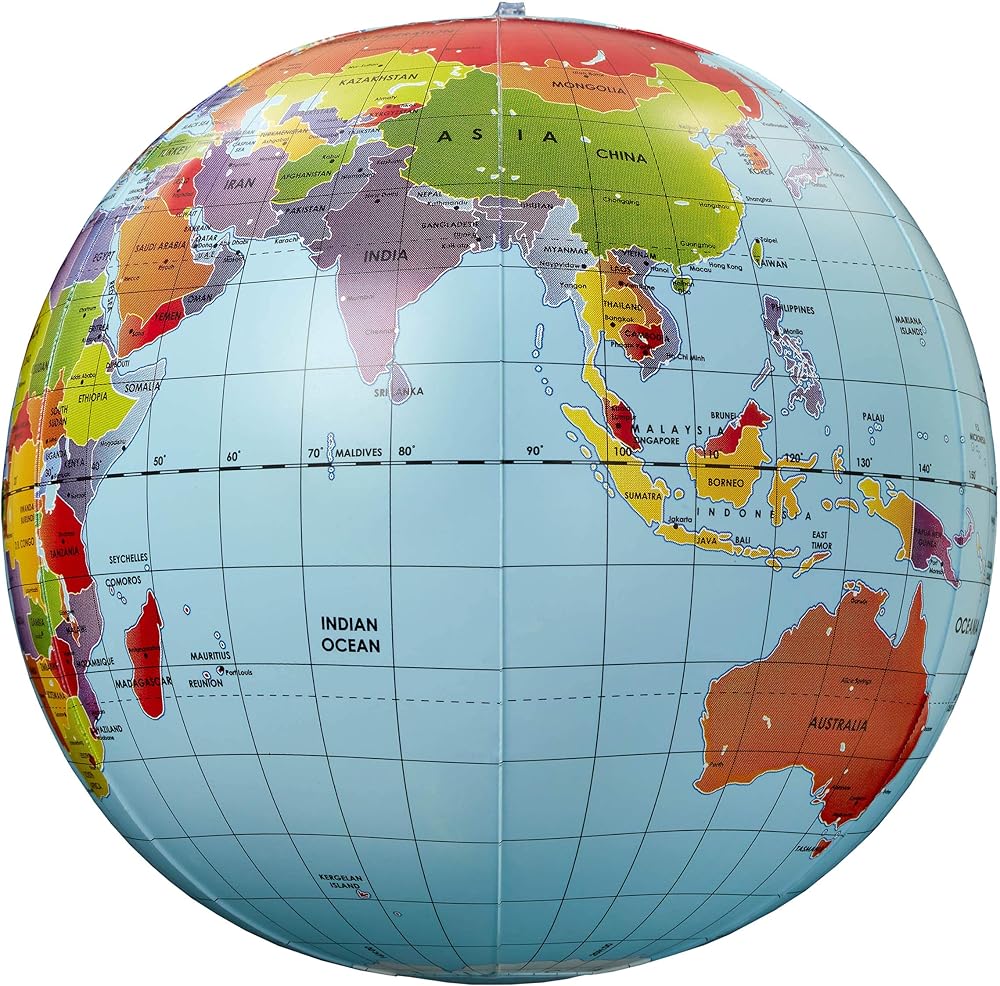 تأتي هذه الكرة السياسية القابلة للنفخ بطول 30 سم بتصميم أصلي وملون. تتميز الكرة الأرضية بلمسة نهائية عالية الجودة وتظهر خطوط الطول والعرض. يمكن للأطفال رمي الكرة الأرضية لبعضهم البعض وتحديد القارات والبلدان والعواصم والمحيطات مما يجعل الجغرافيا ممتعة لجميع أفراد العائلة. تتضمن ورقة أفكار ألعاب تعليمية للاستخدام في المنزل أو في الفصل الدراسي أو حتى لتعلم الجغرافيا أثناء اللعب على الشاطئ أو في الحديقة. يمكن نفخ الكرة الأرضية بسهولة ويمكن تعليقها لخلق عرض لافت للنظر. .