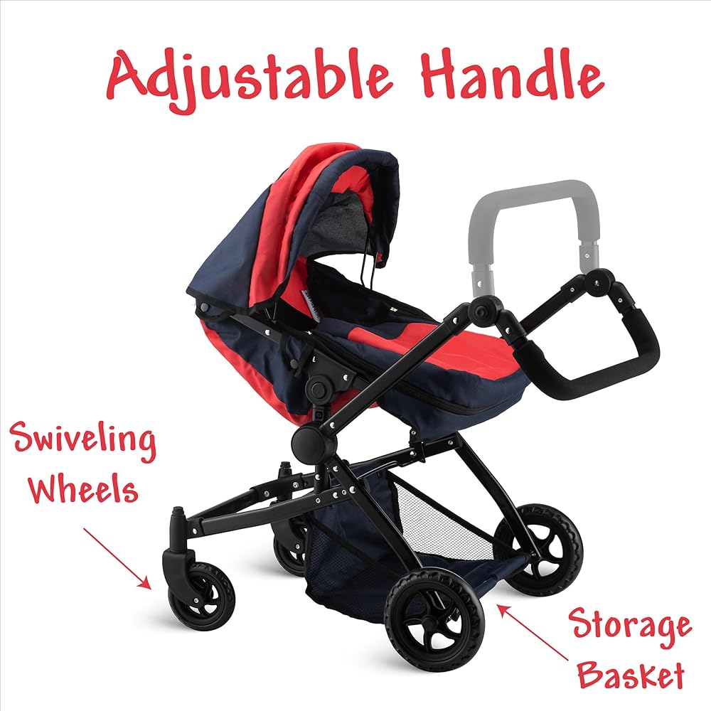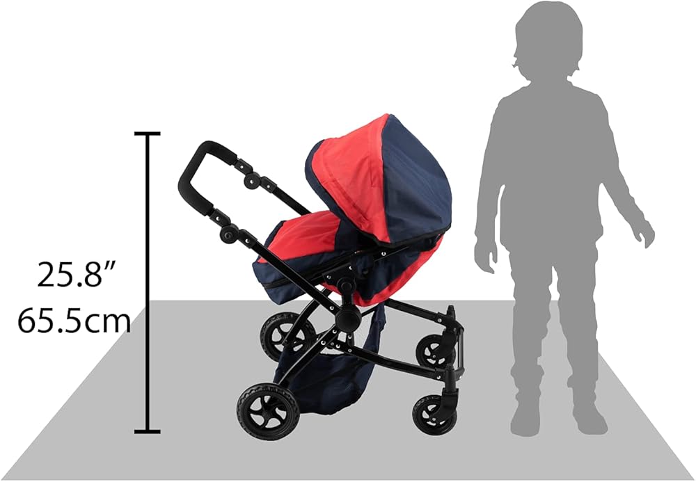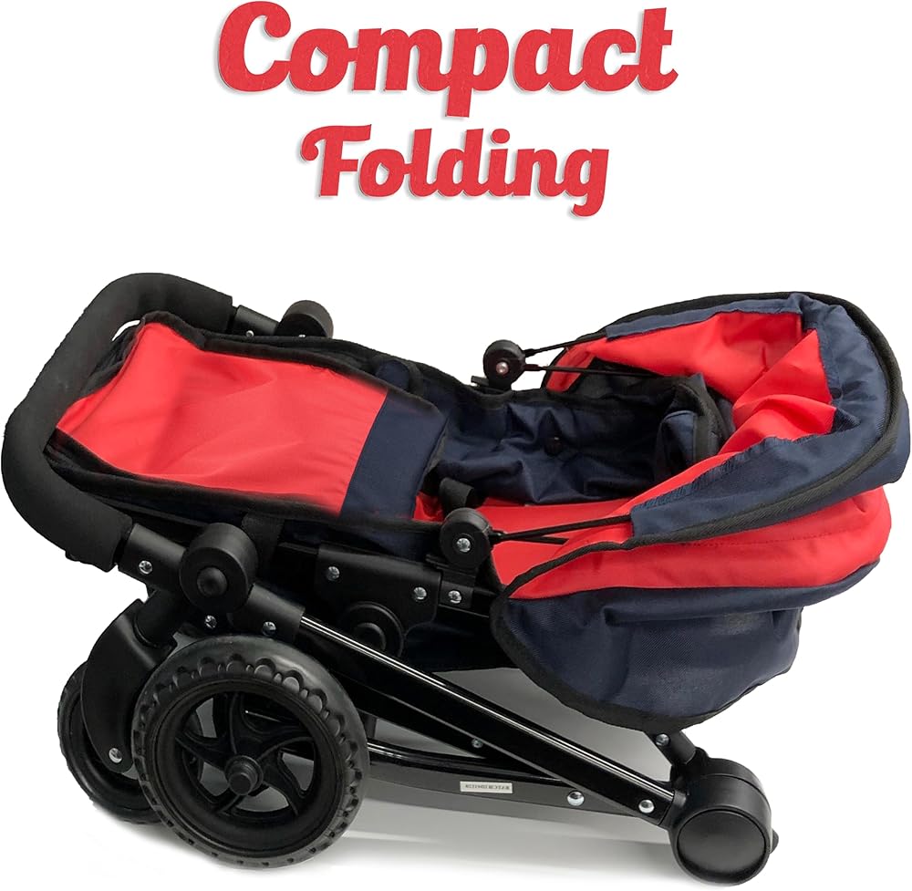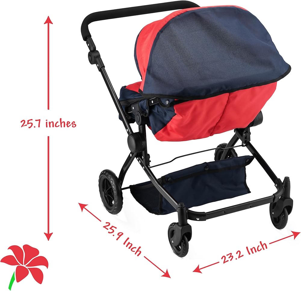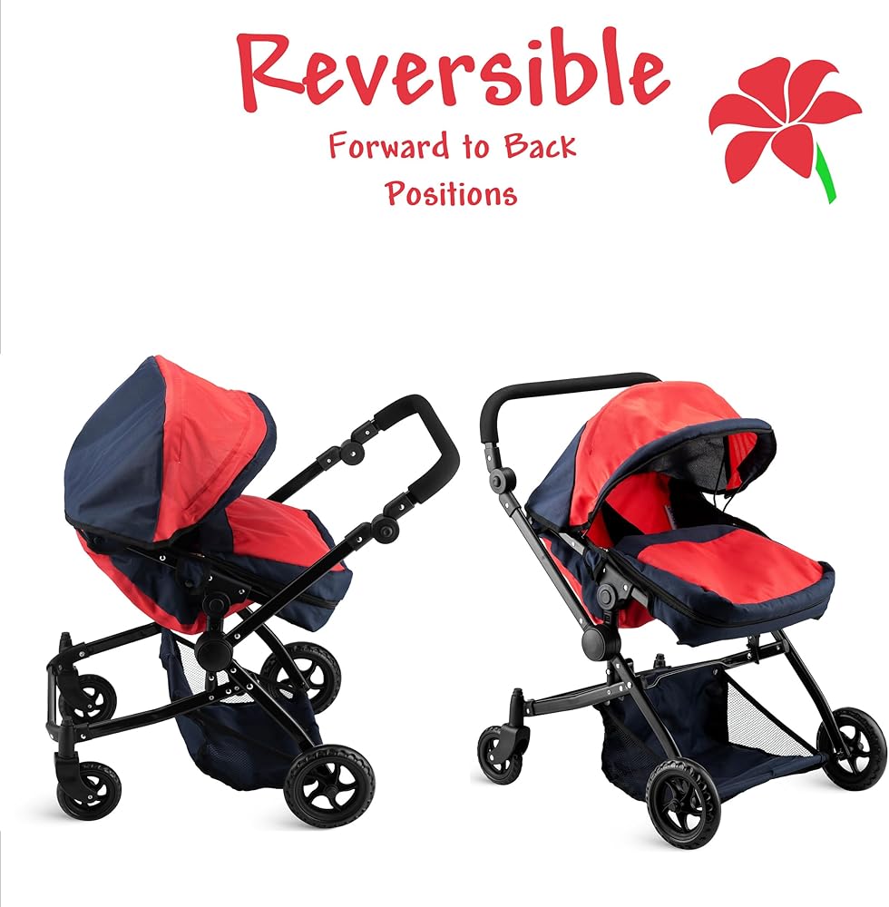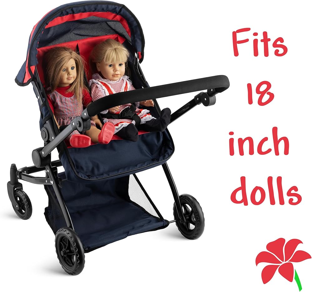 عربة دمى مزدوجة فاخرة: اجعلها عربة أطفال / عربة أطفال في وضع الجلوس أو في وضع الاسترخاء. يمكن تحريك المقبض حتى تتمكن الدمى من مواجهة طفلك أو مواجهة الشارع. حزام مقعد في كل مقعد، سلة في الجزء السفلي
