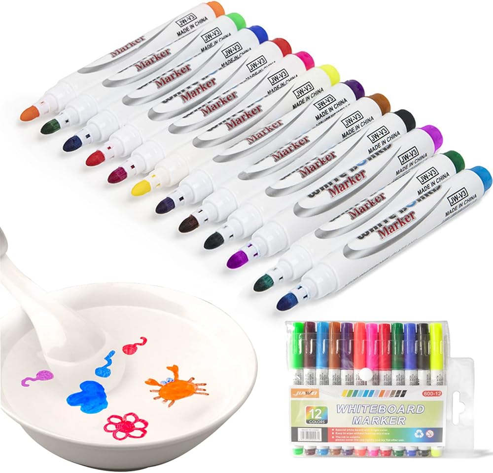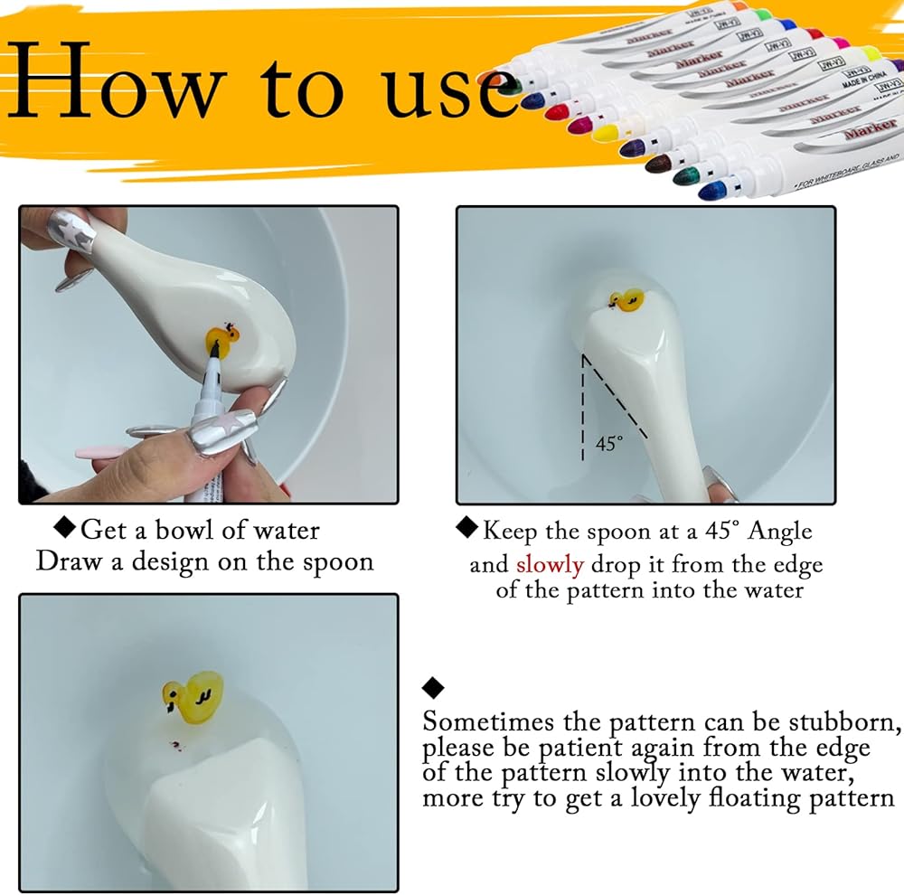 【أقلام تحديد قابلة للغسل】استخدم هذا القلم السحري للرسم على ملعقة البورسلين. عند مواجهة الماء، سوف يطفو المرسوم من تلقاء نفسه. ارسم النمط الذي تريده على الملعقة (غطيه بالكامل)، انتظر 5-10 ثوانٍ حتى يجف الحبر، ثم ضعه في الماء، ثم ضعه ببطء في الماء من حافة النمط، وسوف تراه يطفو.