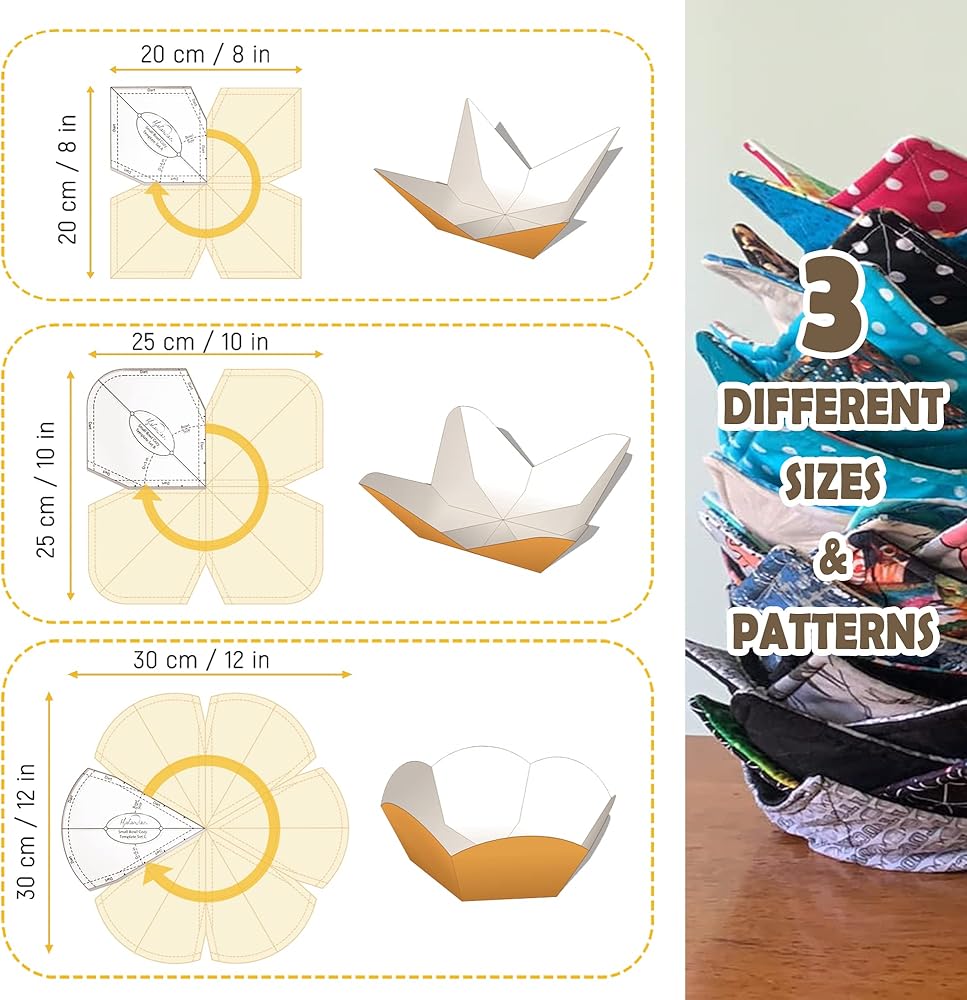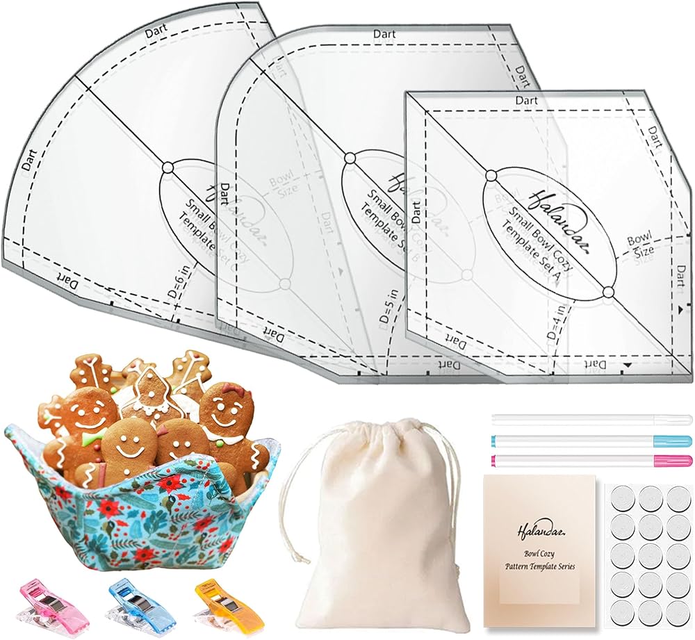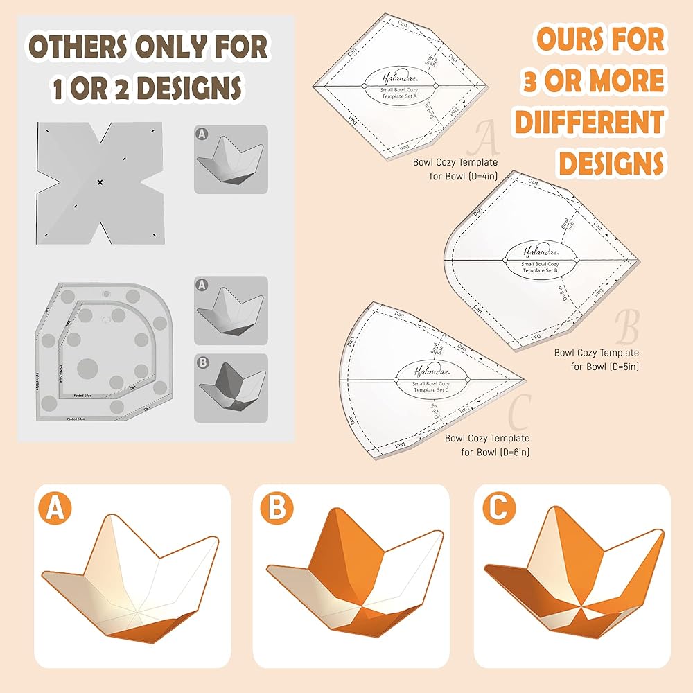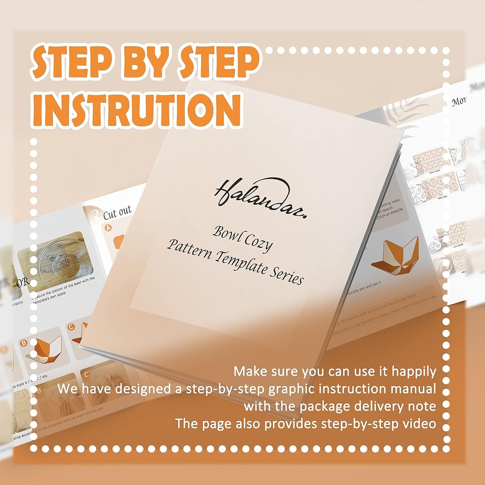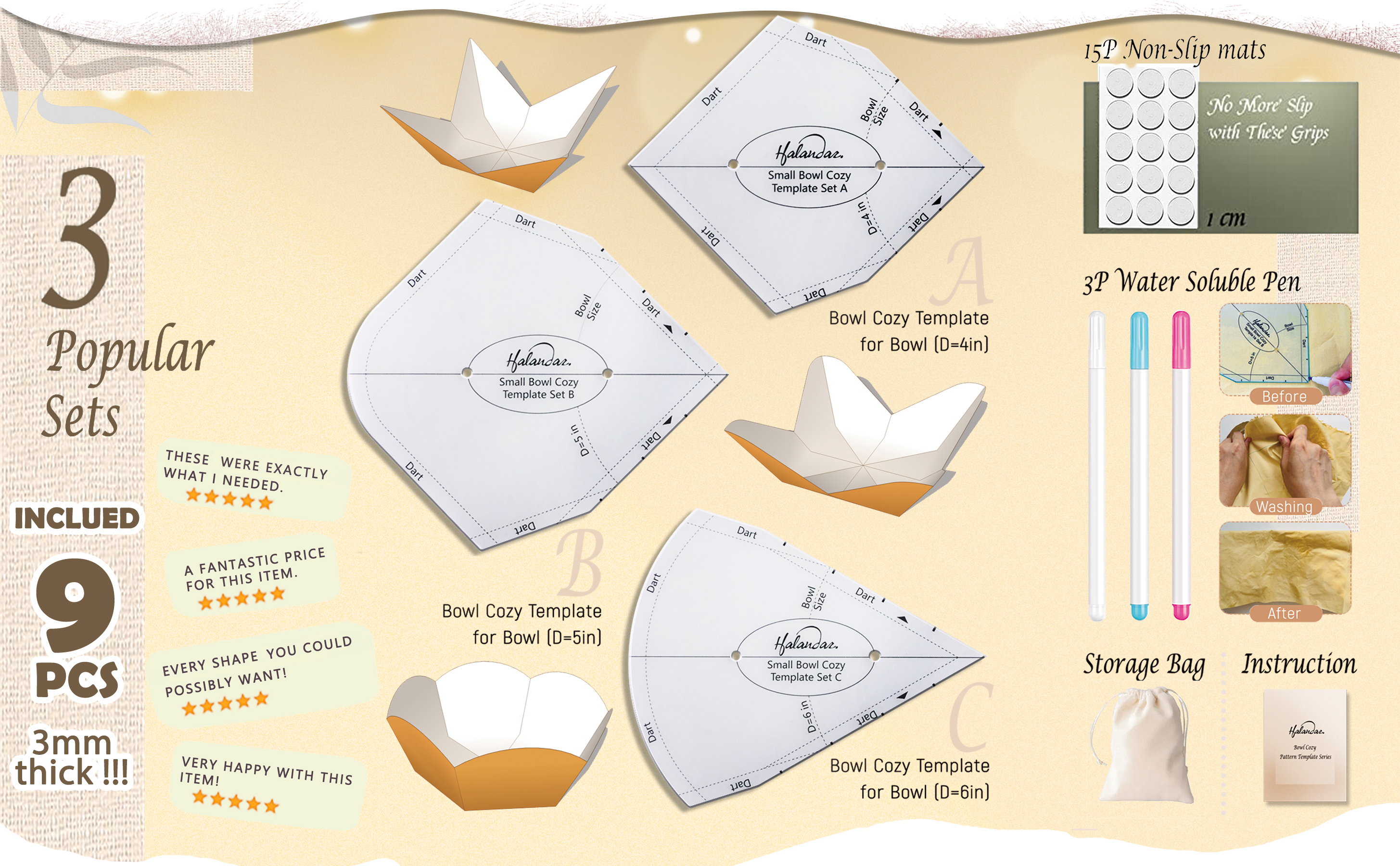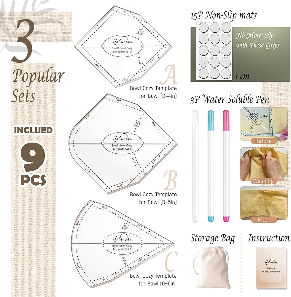 ⭐️Easy to Use⭐️ Bowl cozy template for sewing is covered with protective film at the back to help prevent the templates from being scratched or stained with dust, tear them off before use, you can use these water soluble pens to mark, then cut cloth into some patterns you like together with cutter (not included), and sew the cloth together, you will get a nice bowl mat