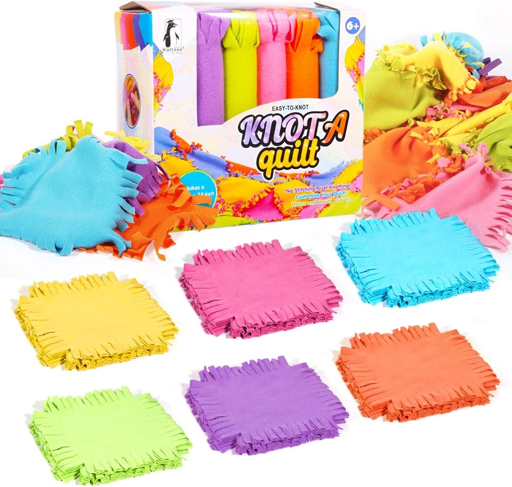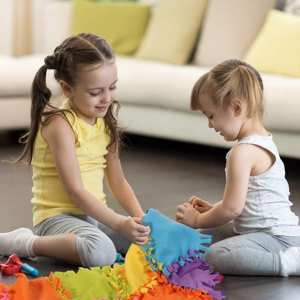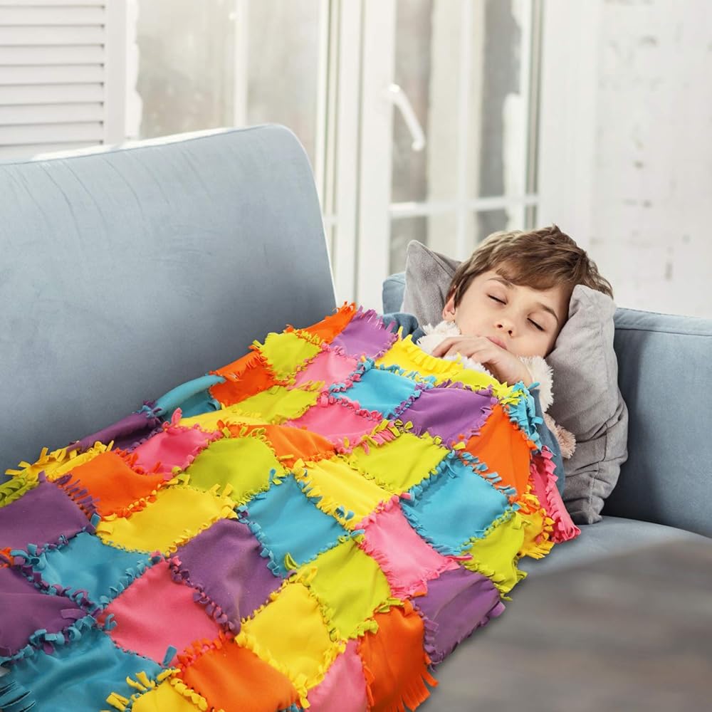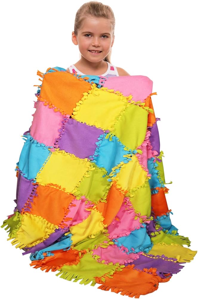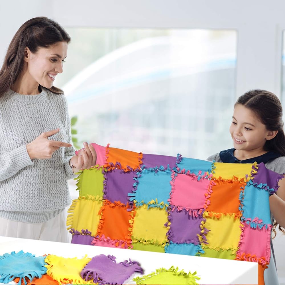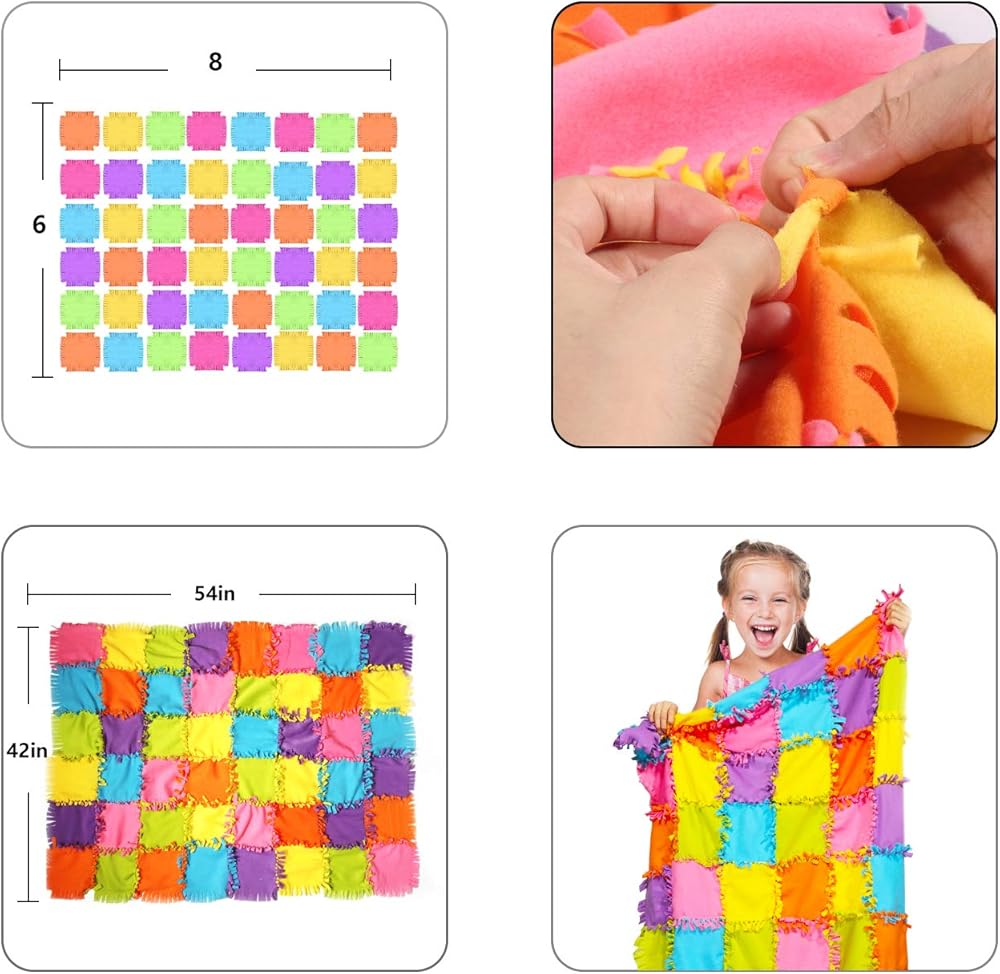 مشروع حرفي كامل - تأتي مجموعة البطانية بدون خياطة هذه مع كل ما تحتاجه لطفلك أو حفيدك لصنع لحاف صوفي جميل. تتضمن 6 ألوان زاهية مختلفة من مواد سميكة عالية الجودة، و8 قطع من كل لون، مما يترك مساحة كبيرة للأنماط الإبداعية التي ستبني مهارات العلوم والتكنولوجيا والهندسة والرياضيات لدى الطفل وتطور إبداعه