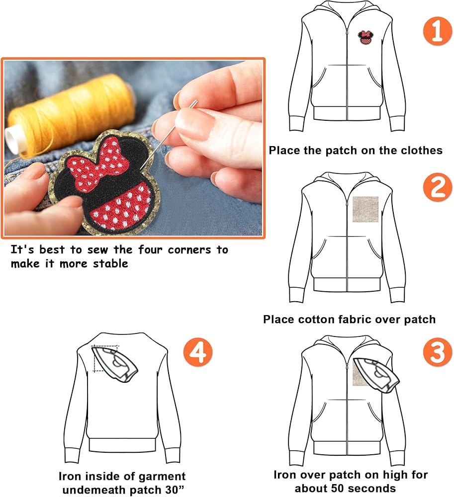 💥【الاستخدام】 قم بالكي أو الخياطة. سخني المكواة إلى 150 درجة (302 فهرنهايت) وقم بالكي كما هو موضح في الصورة لمدة 50 ثانية، أو يمكنك خياطة بعض الإبر على طول جانب الزخرفة، مما يجعلها أكثر أمانًا.