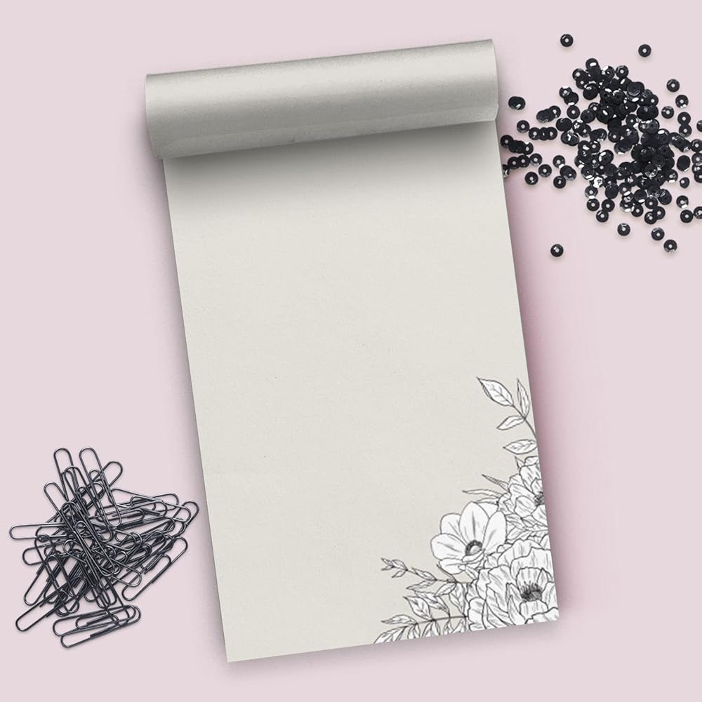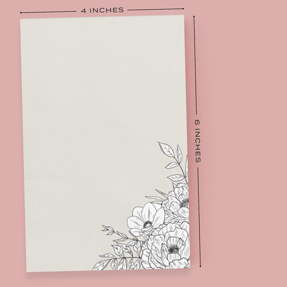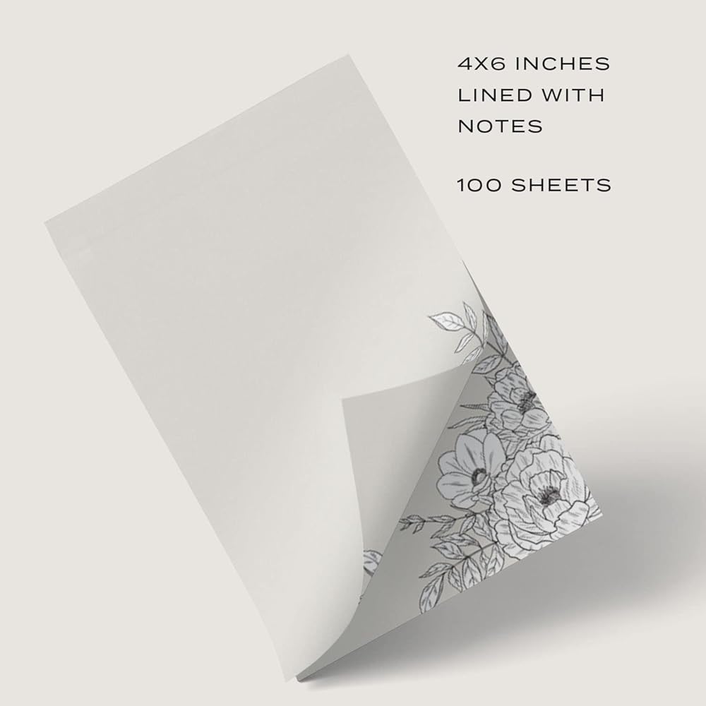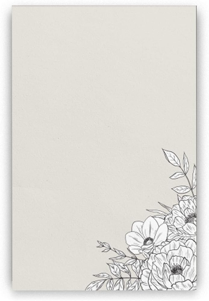 تتميز دفاتر الملاحظات الزهرية مقاس 4x6 بوصة بخلفية بيج مع إشعار زهور باللونين الأبيض والأسود في الزاوية اليمنى السفلية. كل ورقة من هذه الورقات الـ 100 عبارة عن ورق غير مطلي بوزن 68 رطلاً مثالي لجميع أنواع الأقلام. مع لوحة فنية بيضاء مقاس 14 نقطة لدعم لوحة مذكرة قوية. تعد دفتر الملاحظات مقاس 4x6 بوصة أو دفتر الملاحظات هو الحجم المثالي لأي ديكور مكتب أو سطح مكتب أو قائمة بقالة للمطبخ. معبأة في حقيبة شفافة محكمة الغلق، وتعتبر هدية جميلة. تشتمل كل لوحة خدش على خلفية فارغة غير مبطنة لحفظ القوائم وكتابة الملاحظات.