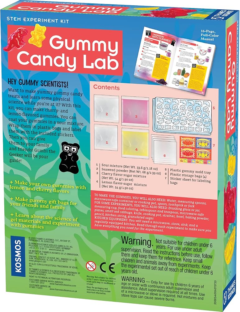 قم بصنع الحلوى اللذيذة الخاصة بك باستخدام مكون طبيعي يشبه الجيلاتين يسمى الكاراجينان والذي يأتي من الأعشاب البحرية! نكهي الخليط وحليه بنكهتين ثم قومي بتشكيل أشكال الجيلي في القالب المرفق. يمكنك أيضًا إضافة حامض الستريك لصنع العلكة الحامضة! التعرف على الخصائص العلمية للبوليمرات الطبيعية. المكونات الغذائية متضمنة.