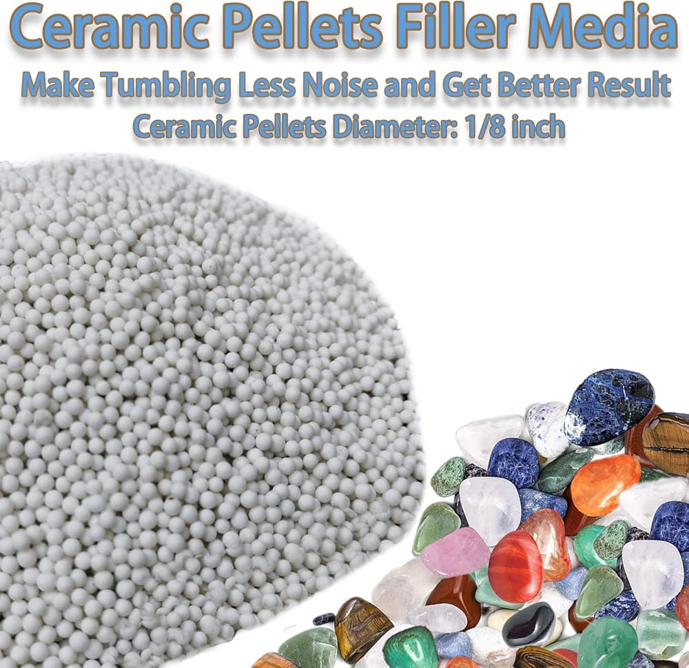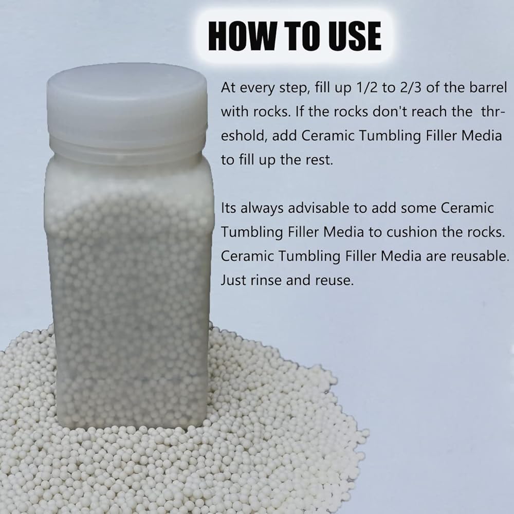 Ceramic tumbler media makes the entire rock tumbling process more effective, improving delivery of rock tumbling grit, quieting tumbler noise, reducing rock breakage, and acting as a filler for smaller batches