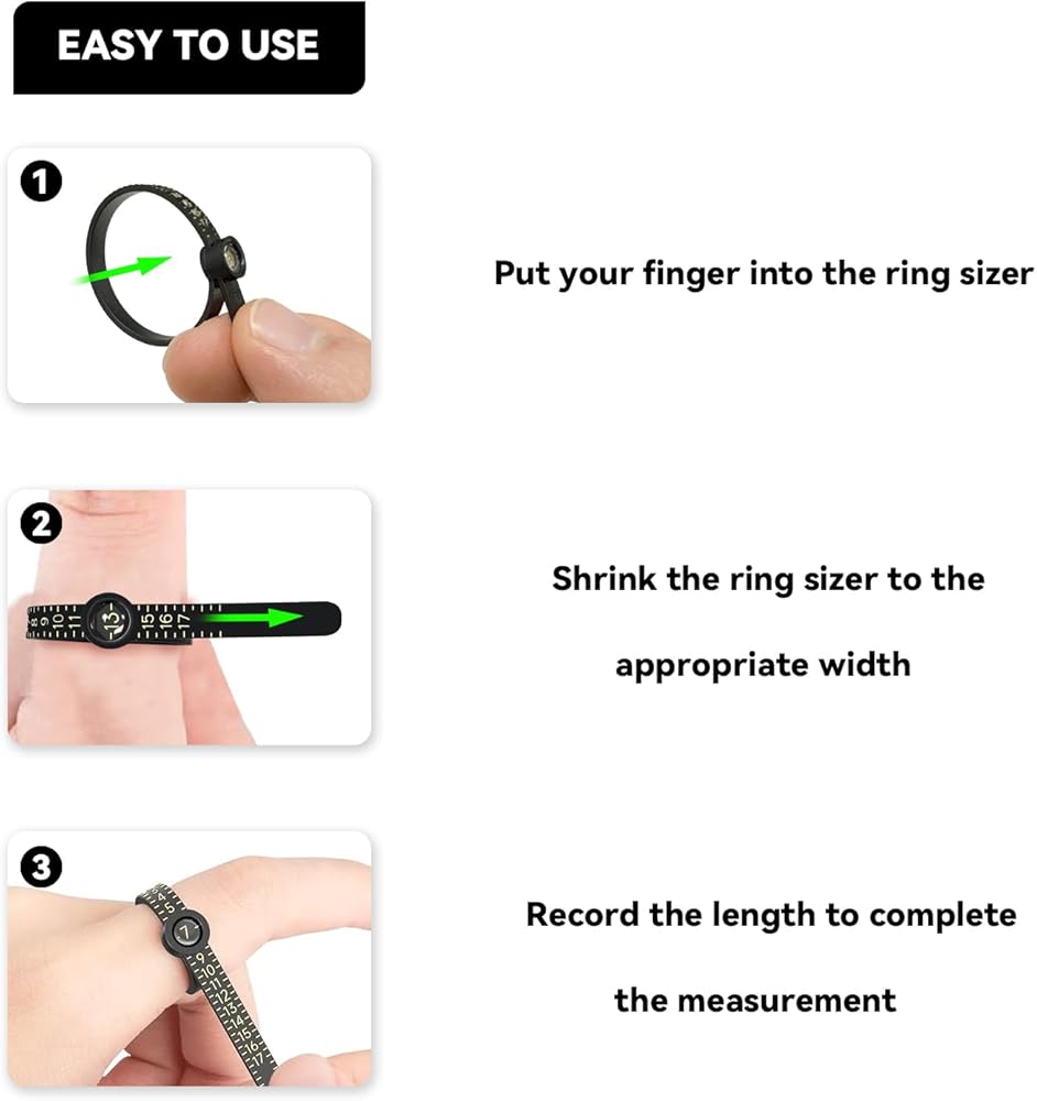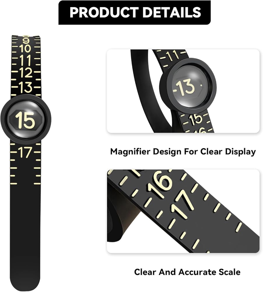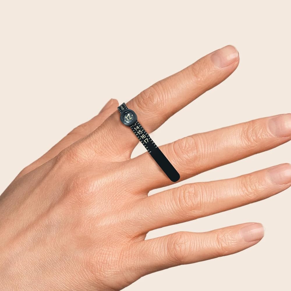 سهلة الاستخدام: تم تصميم أداة قياس حجم الخاتم الخاصة بنا من أجل البساطة وسهولة الاستخدام. ما عليك سوى تمرير الحلقة على المقاس وقراءة الحجم المشار إليه. لا حاجة لقياسات معقدة أو التخمين.