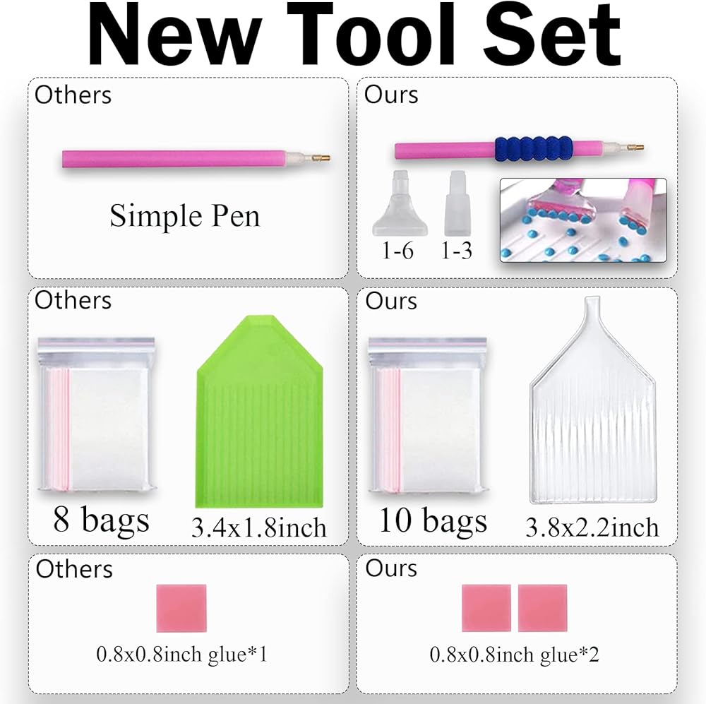 تتضمن مجموعة الرسم الماسي الخاصة بنا اثني عشر قطعة رائعة من الأدوات والإكسسوارات الأساسية التي ستحتاجها لإكمال تحفتك الفنية. الأدوات المتضمنة في المجموعة هي قلم رسم ماسي وصينية وملاقط وأكثر من ذلك. لا تشتمل المجموعة على إطار، ولكن القماش مصمم ليناسب المقاسات القياسية. يمكنك بسهولة العثور على الإطارات المناسبة في أي متجر محلي للحرف اليدوية أو التأطير.