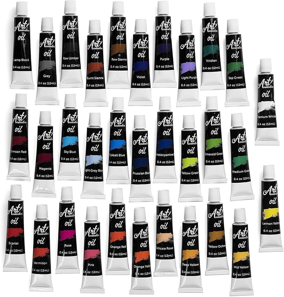 تقدم لك ارت اكسيليرايتور مجموعة طلاء زيتية احترافية تتضمن 32 لونًا زاهيًا ومشرقًا بشكل جميل. يحتوي كل أنبوب على طلاء بقيمة 12 مل.
