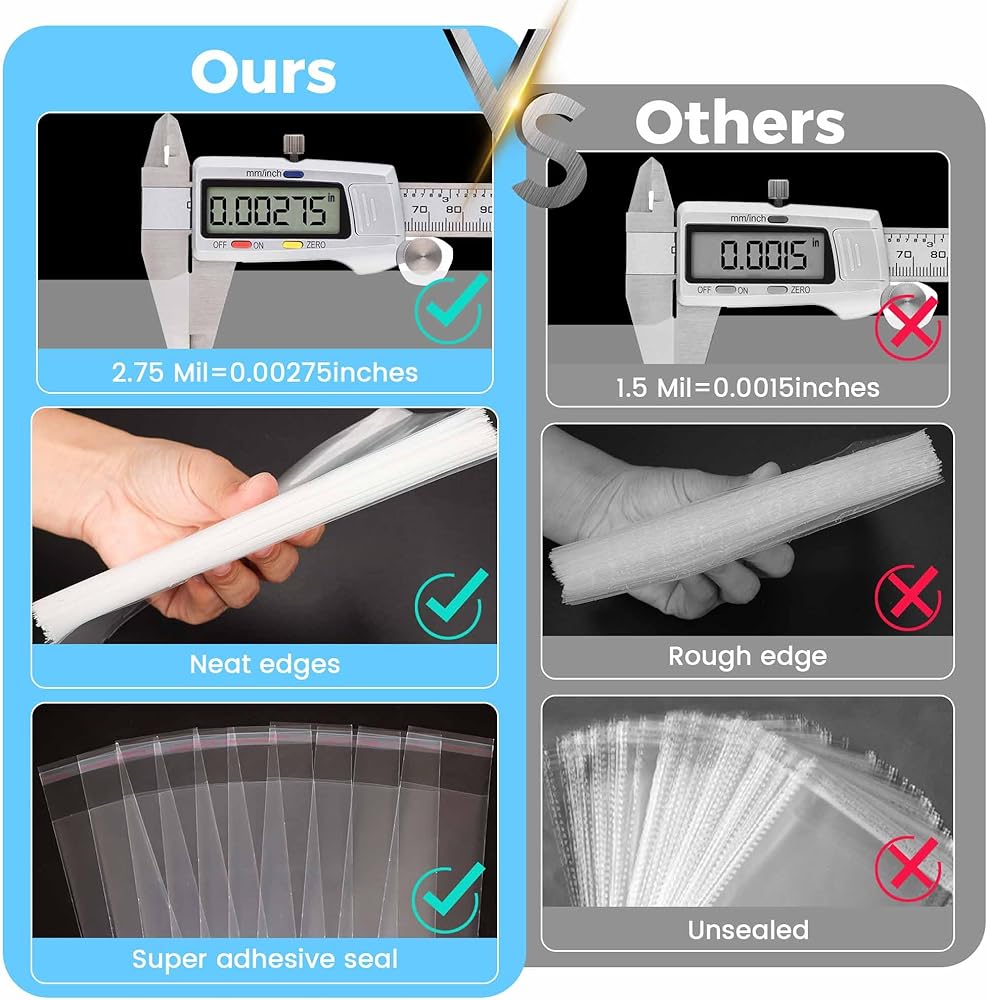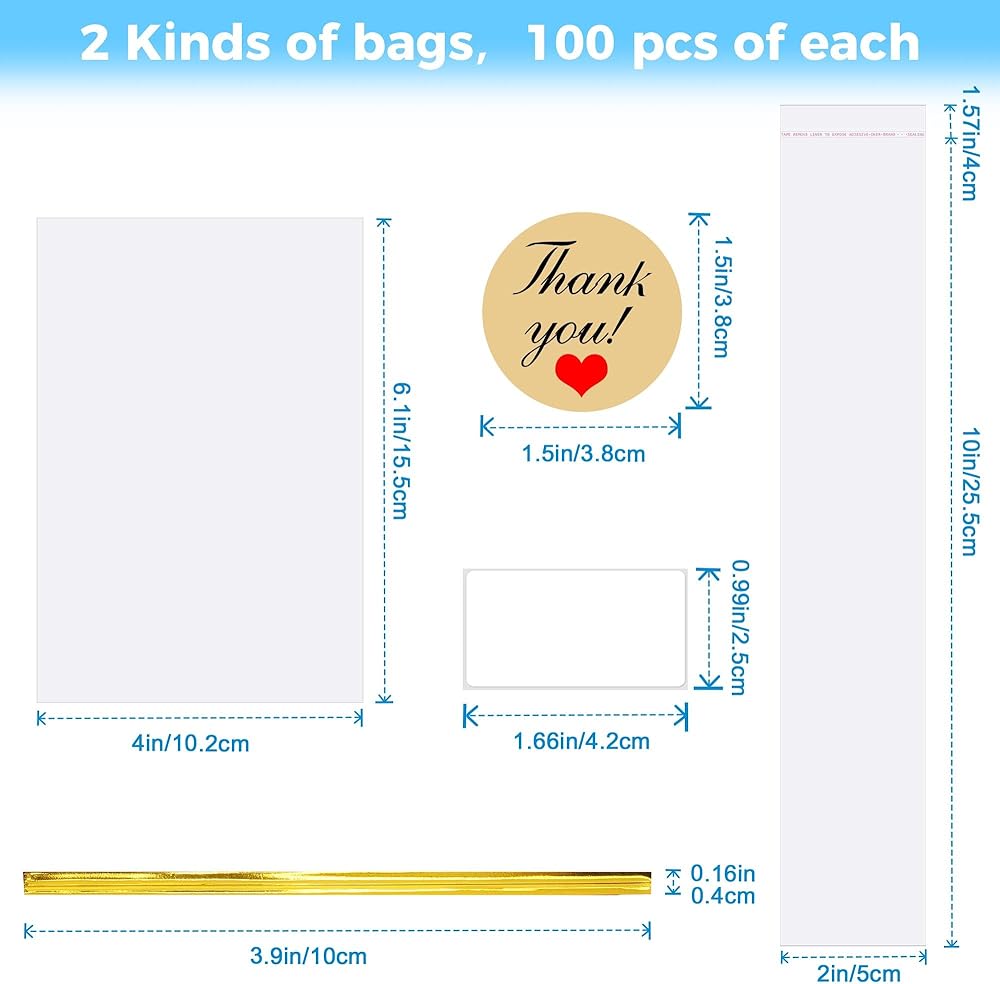Are you looking for premium cellophane treat bags for your party, weddings, bakery, pretzel rods, cookies or other items? Our clear plastic cellophane bags are ideal choice for all your packing needs.Size: 4" x 6" inch, 2" x 10" inchColor: transparentPackage Content: 100 pcs 4" x 6" flat cellophane treat bags, 100 pcs 2" x 10” resealable self sealing pretzel rods bags, 100 twist ties, 20 pcs blank self-adhesive label paper and 20 pcs thank you stickers.Attractive Twist Ties: These cellophane treat bags for a finishing touch on party, Cellophane bags with twist ties make your bags and wrapping more beautiful and fun, and increased the festive atmosphere.Easy To Use: The 4" x 6” clear flat cellophane treat bags with twist ties allow for a very fast and easy way to seal the bag. The 2" x 10” clear resealable self sealing cellophane bags contain widened adhesive sealing strip, can seal tightly and keep your food fresh longer.Safe Material: Clear plastic cello bags made of new Oriented Polypropylene, the cellophane treat bags clear, durable, odorless, environmentally friendly, safe than PP plastic bags, not harmful to your body. Clear plastic OPP Poly bags that protect the contents from dust, bugs, fingerprints, moisture, and mildew.Premium Quality: Our OPP plastic bags are made of 1.4 mils thickness material, cello cellophane bags will not rip or tear when handled with. Clear cello bags feature for high moisture, freshness and odor barrier. The quality OPP treat bags are something that shouldn't be missing in any kitchen storage and you won't have to look further.Multiple Uses: Our cellophane treat bags are a must have for party, weddings, bakery and varieties of festivals. Clear plastic cellophane bags also can be used for pretzel rods, cookies, candy, chocolate and other items.