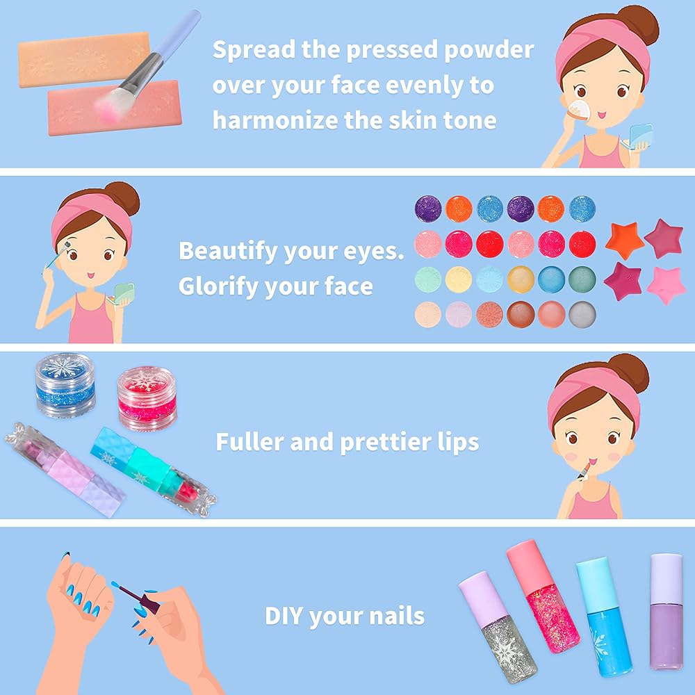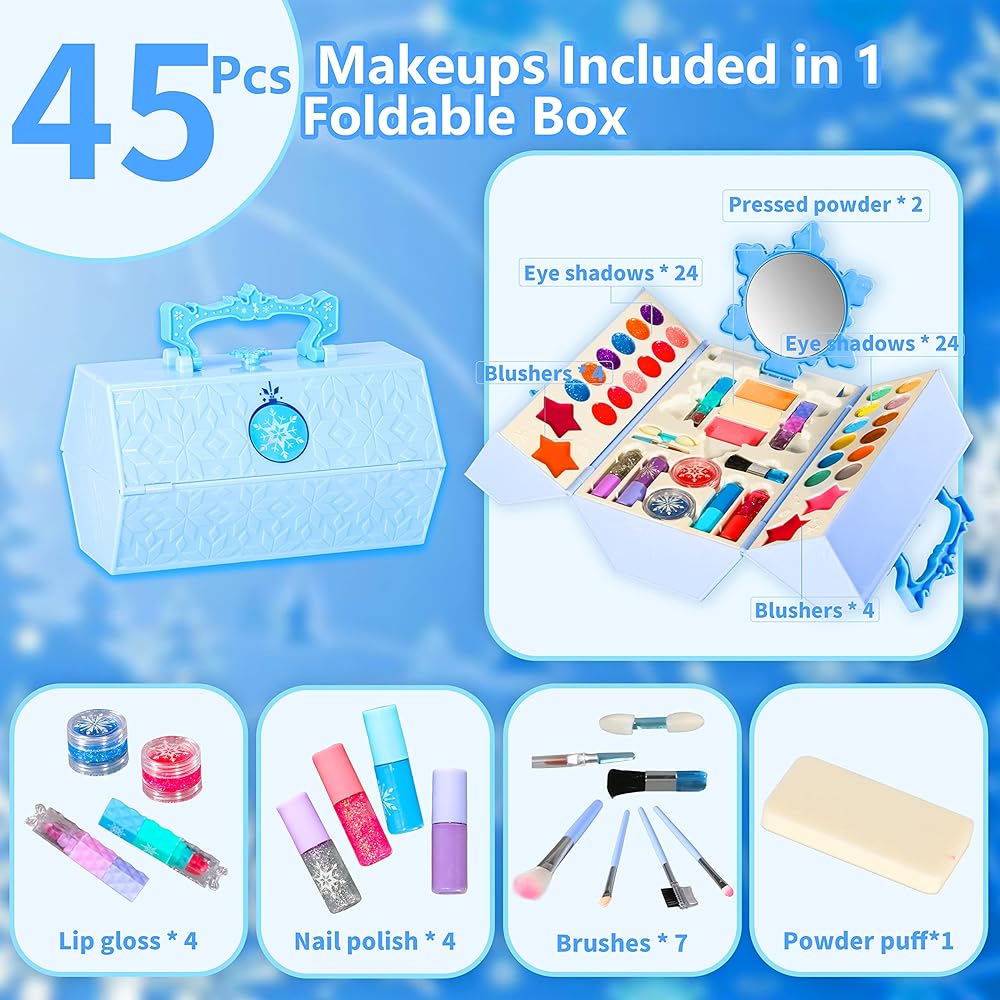 ❄️[45 قطعة في مجموعة مكياج واحدة]: تتضمن ألعاب مكياج بيلوتشيدو جميع مستلزمات المكياج وفنون الأظافر الضرورية، بما في ذلك 24 ظل عيون، 4 أحمر خدود، 2 بودرة بودرة، 2 أحمر شفاه، 2 ملمع شفاه، 4 زجاجات طلاء أظافر، 7 فرش مكياج، 1 بودرة ومرآة. للحصول على صندوق مستحضرات التجميل هذا، يمكن للفتيات صنع مكياج جميل ويصبحن أميرة جميلة!